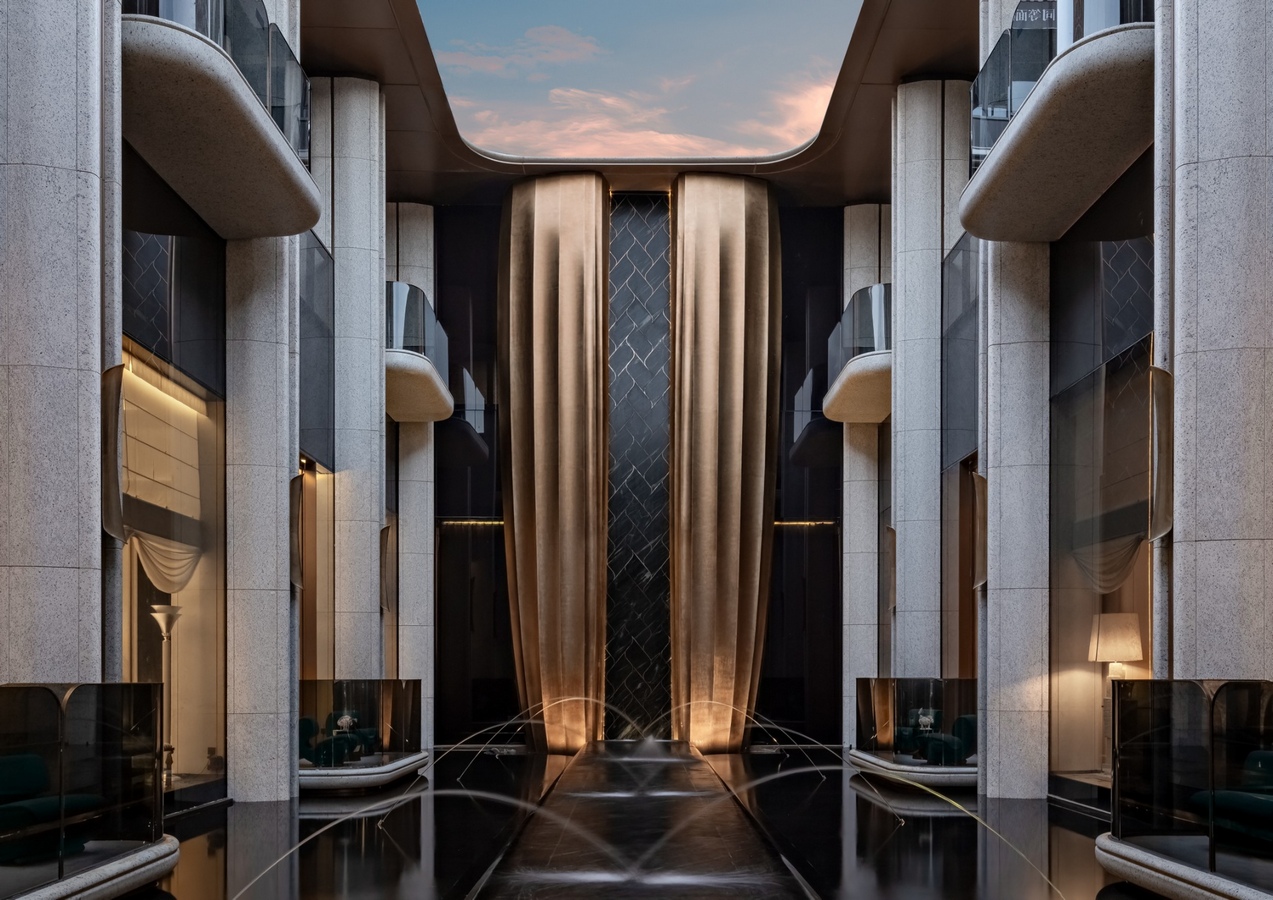Every element integrates water installations, light choreography, and architectural skin textures, culminating in a minimalist luxury aesthetic that echoes the “less is more” philosophy — restrained, timeless, and poetic.