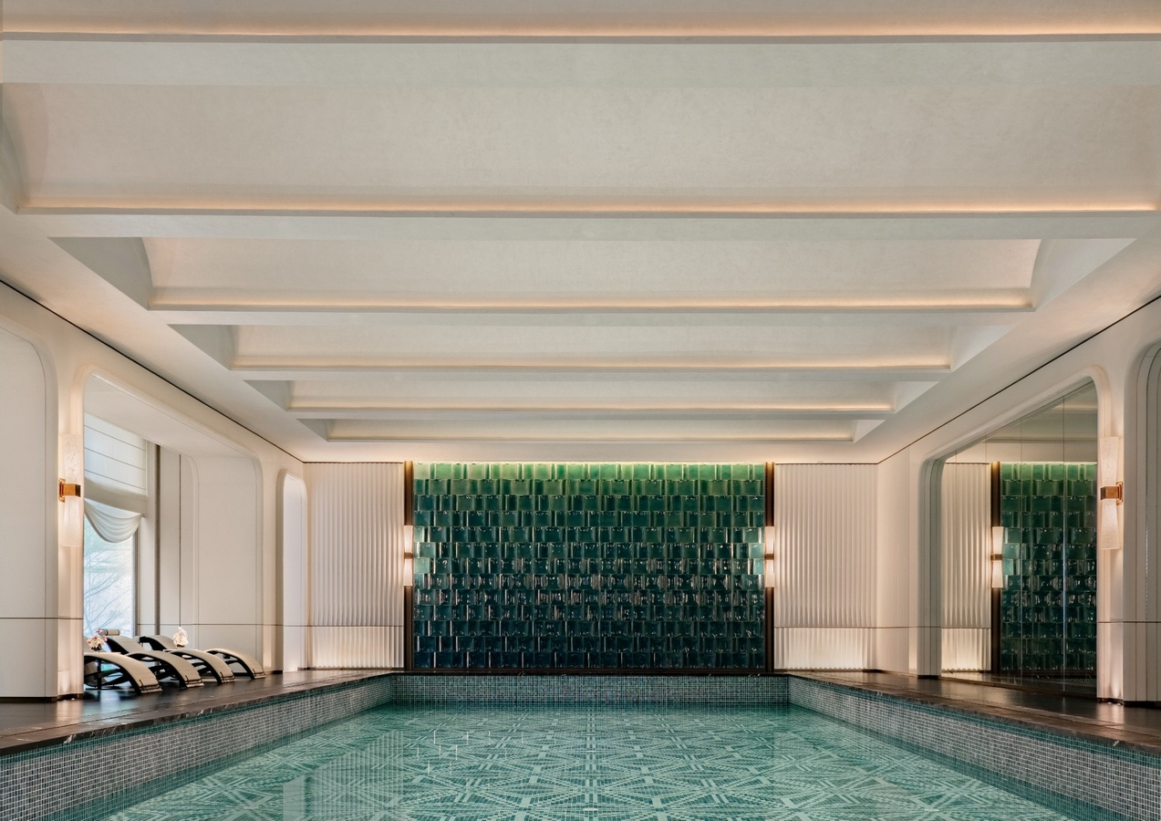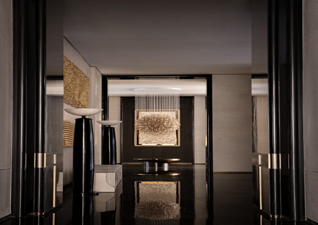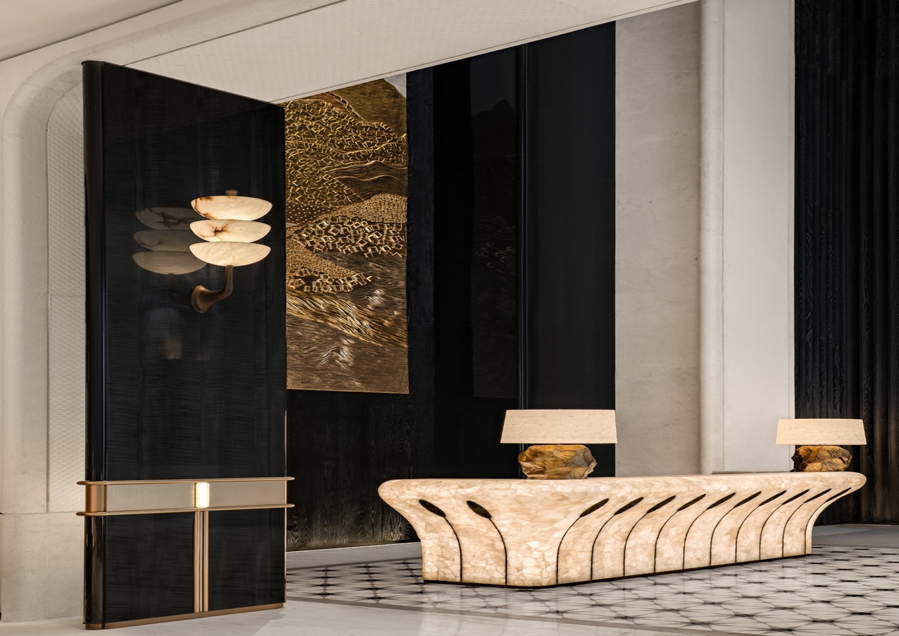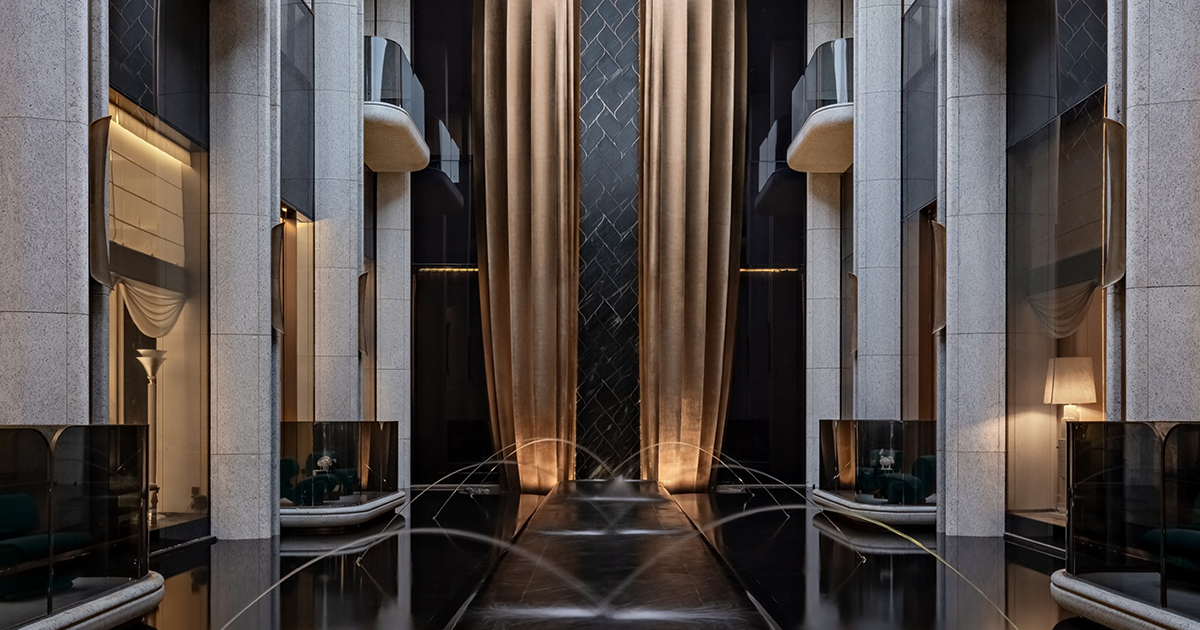 An 11-meter vertical axis evokes a solemn sense of ceremony, while a panoramic façade reimagines the Pantheon’s oculus with a sculptural background wall — reflecting the aesthetic tension between classical geometry and modern luxury.