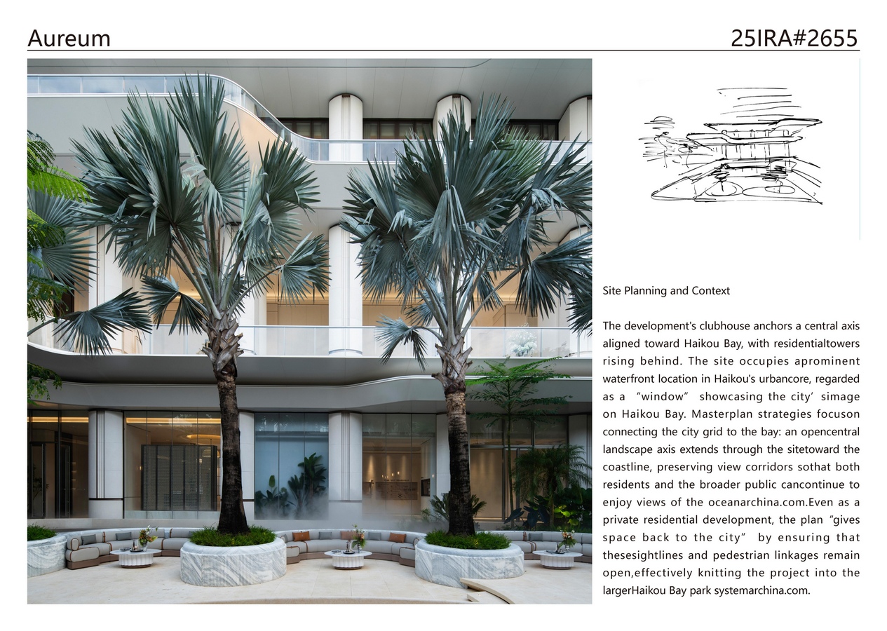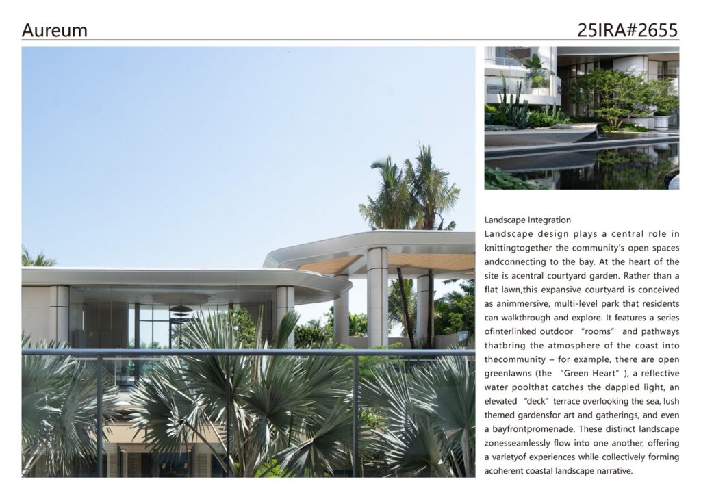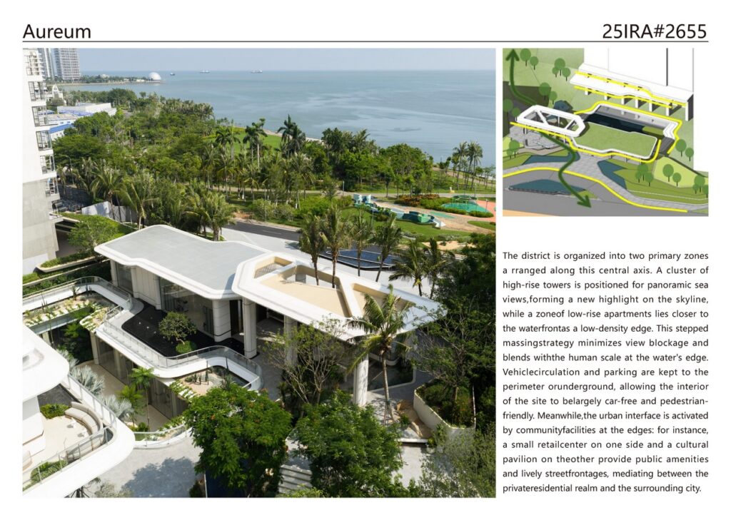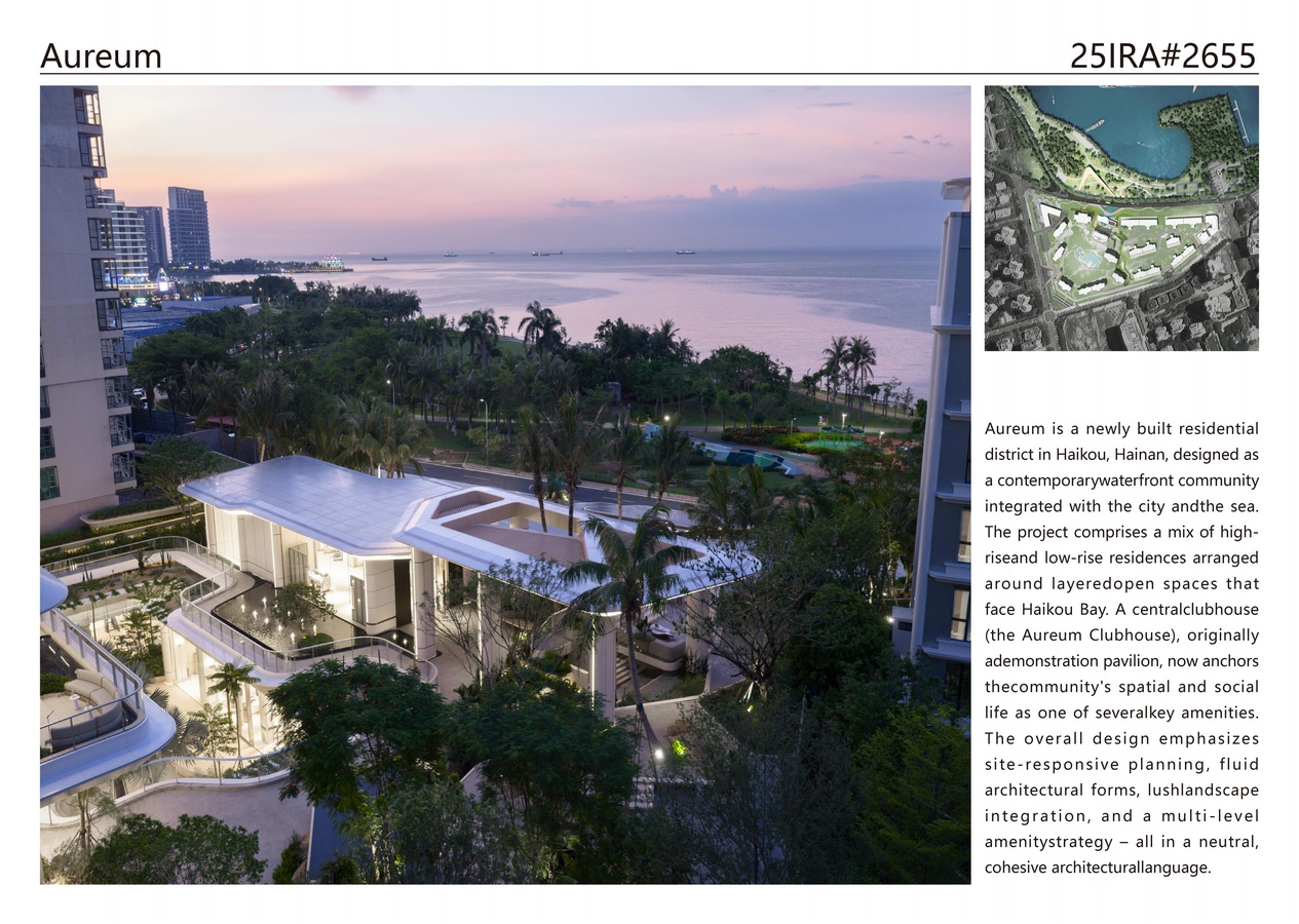 Shanghai PTArchitects: Winner of International Residential Architecture Awards 2025. Aureum is a newly built residential district in Haikou, Hainan, designed as a contemporary waterfront community integrated with the city and the sea. The project comprises a mix of high-rise and low-rise residences arranged around layered open spaces that face Haikou Bay. A central clubhouse (the Aureum Clubhouse), originally a demonstration pavilion, now anchors the community’s spatial and social life as one of several key amenities. The overall design emphasizes site-responsive planning, fluid architectural forms, lush landscape integration, and a multi-level amenity strategy – all in a neutral, cohesive architectural language.