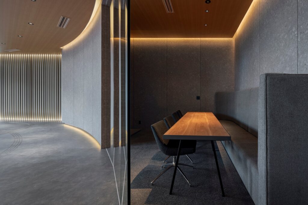 The unique design of the ceiling is particularly noteworthy. It is divided into two levels, one high and one low. The higher section is made of multiple thinly sliced panels, creating a floating feeling. Indirect lighting filters in through the joints between the panels, creating a fantastical ceiling. This is truly the highlight of the space. Indirect lighting is also installed in various other areas, effectively enhancing the space.