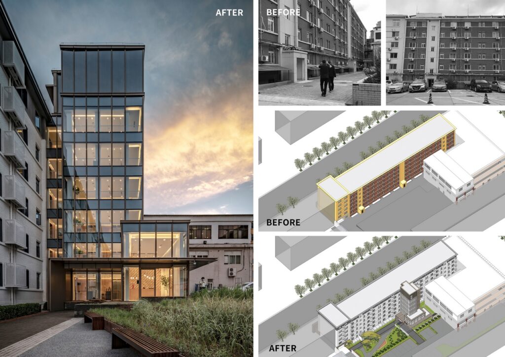 HONGSHI DESIGN: Winner of International Residential Architecture Awards 2023. Our site is located on the northern Central Axis of the Beijing capital city center, with the original architecture built in 1985. The main building consists of 6 levels, with the façade constructed mostly with traditional red bricks.