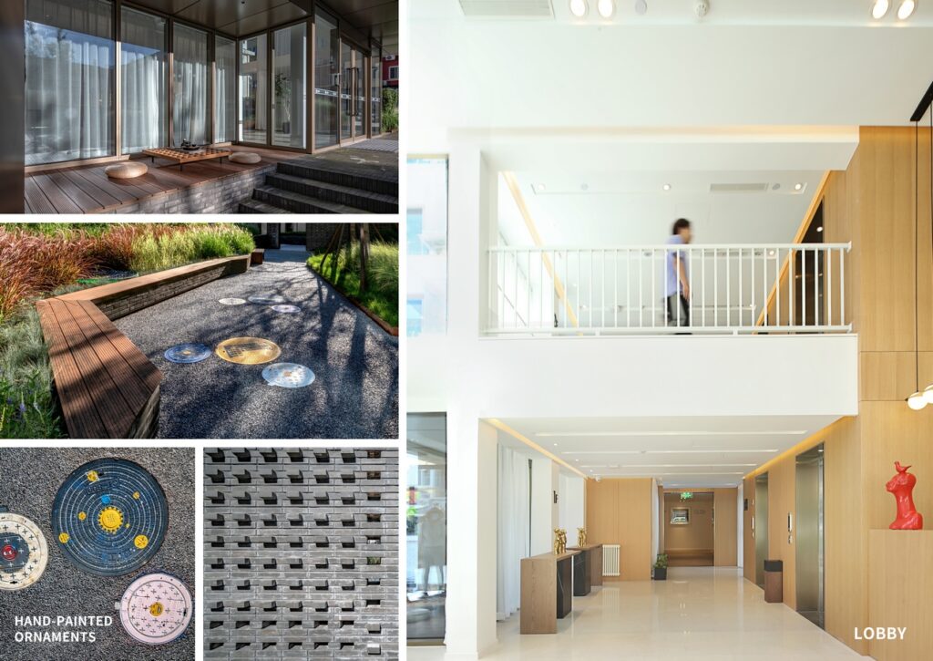 As for the small-scale courtyard enclosed by the building, a pocket garden has been proposed, creating a small and delicate garden within a limited space. Residents could sit and relax here, while the garden itself provides an overall update for the residential surroundings. We have especially hand-painted embellishments on the maintenance hole covers within the area, adding some childlike playfulness to the little gardens.