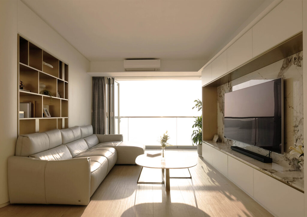 In the grand entrance and main hall, white wood veneer is paired with brass steel and Pandora marble, lending a sense of purity and elegance. A key design feature is the innovative treatment of the original structural columns. Rather than hiding them, the designer transformed these into focal points by extending them into a curved white wood veneer display cabinet. This custom piece, constructed with white wood veneer and electroplated brass steel shelving, features a transparent and orderly structure that allows light to shift subtly throughout the day. The cabinet provides ample storage while visually integrating the columns into the architecture—turning a structural challenge into a design highlight.