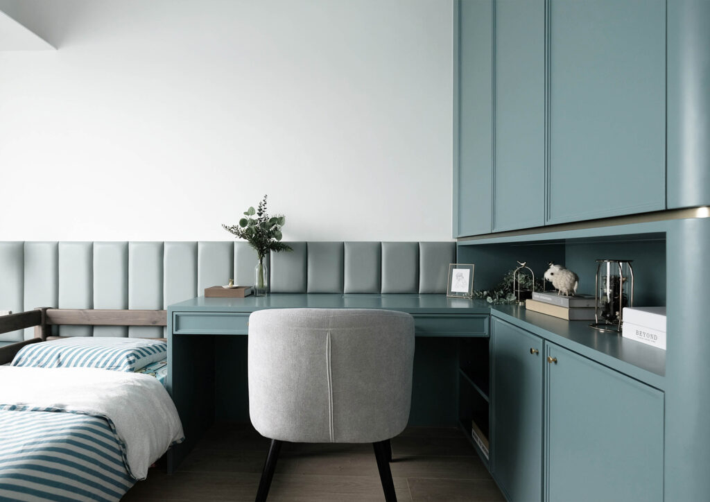 The study features green wood veneer with brass steel frames and shelving, set against black-and-white geometric flooring. A curved desk continues the space’s elegant design language. The children’s room follows Feng Shui principles, using blue as the primary color. The blue wood veneer wardrobe and gray-blue leather headboard wall are accented with brass steel trims. Rounded edges on cabinetry enhance safety during play, combining thoughtful design with practicality. Through its Modern Classicism approach, the HAVEN Bel-Air Duplex successfully merges timeless elegance with contemporary living, resulting in a luxurious, inviting home attuned to modern lifestyles.