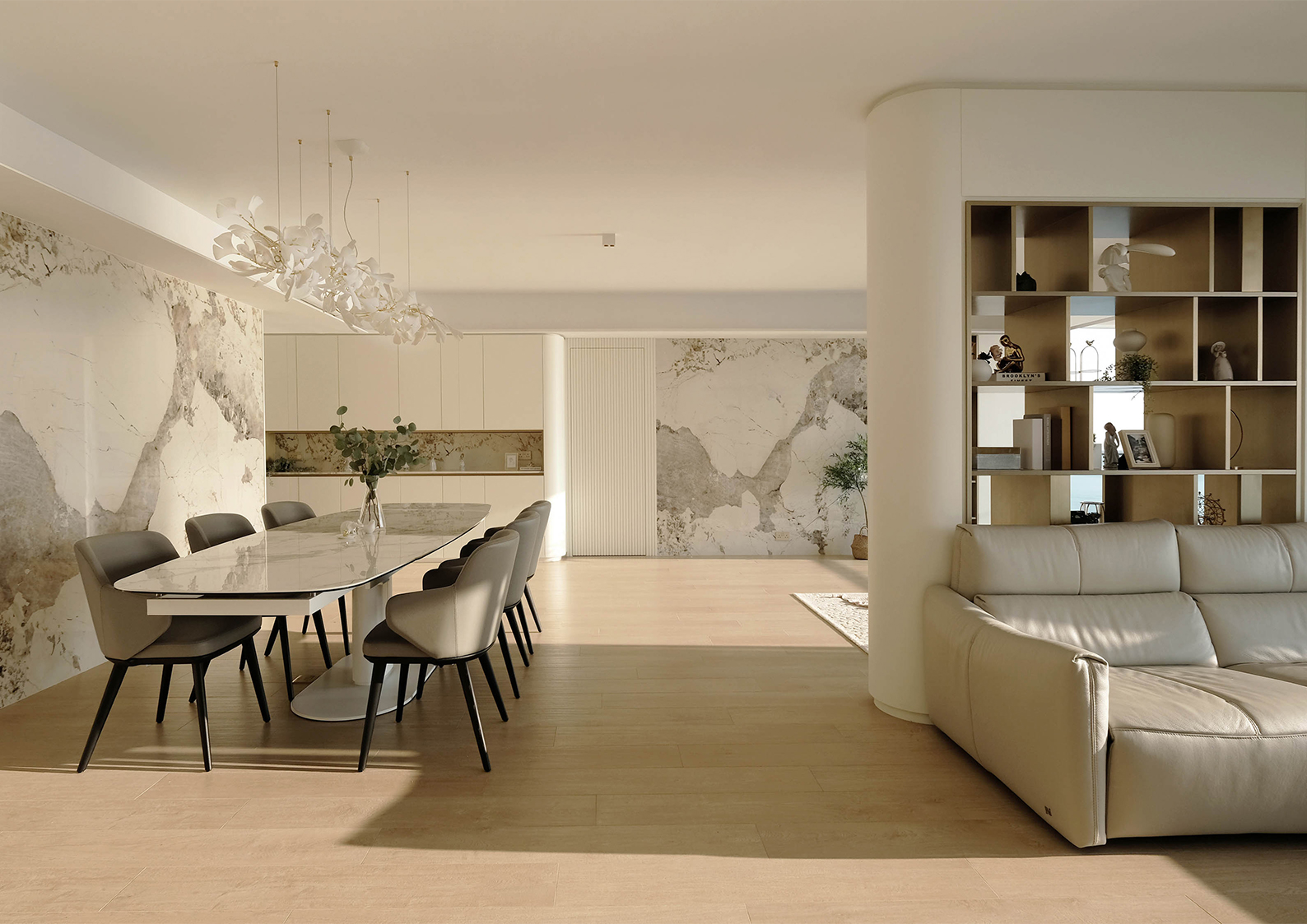 In the grand entrance and main hall, white wood veneer is paired with brass steel and Pandora marble, lending a sense of purity and elegance. A key design feature is the innovative treatment of the original structural columns. Rather than hiding them, the designer transformed these into focal points by extending them into a curved white wood veneer display cabinet. This custom piece, constructed with white wood veneer and electroplated brass steel shelving, features a transparent and orderly structure that allows light to shift subtly throughout the day. The cabinet provides ample storage while visually integrating the columns into the architecture—turning a structural challenge into a design highlight.