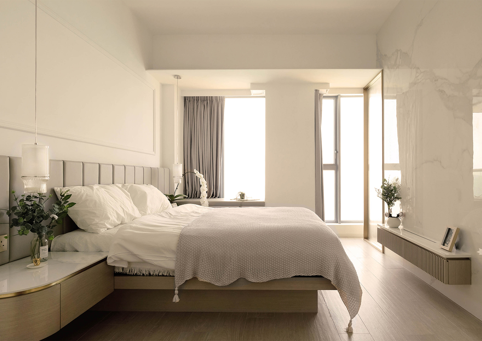 In the master bedroom, smooth curves define the bedside and dressing areas. The SAINT-LOUIS CADENCE Crystal Lampshade pendants add elegance, while a brass steel-framed glass screen separates the dressing zone from the sleeping area. This screen allows light to filter through, casting poetic shadows and enhancing depth. It maintains visual connection while ensuring privacy and addressing Feng Shui considerations. A white marble accent wall also reserves space for a future television, aligning with design and practical needs.