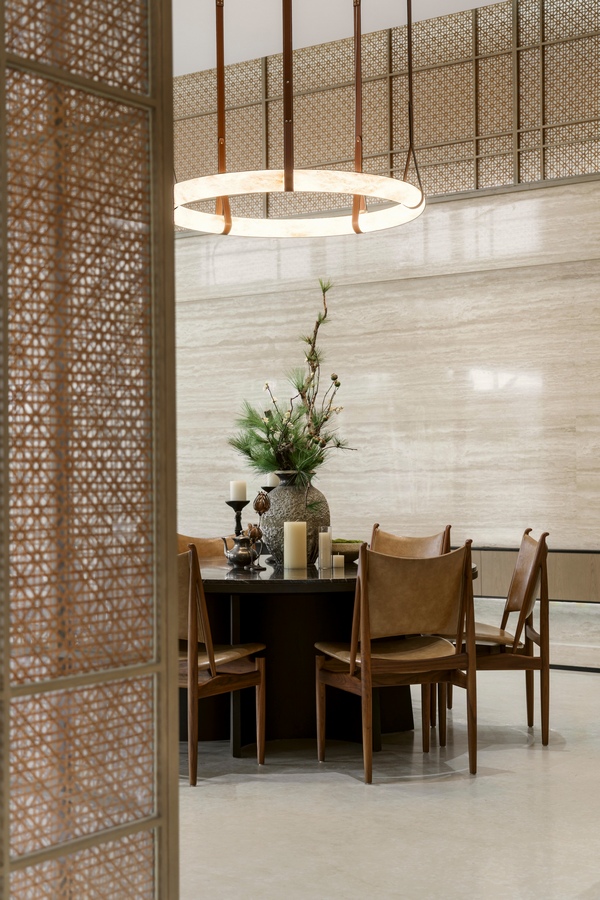 The original form is derived from the exquisite bamboo fish of fishermen, etc. The partition with weaving craftsmanship is set at the corner where the entrance hall meets the interior space, creating a more natural, open and soft area. The dissolved boundaries make the space more flexible and open.