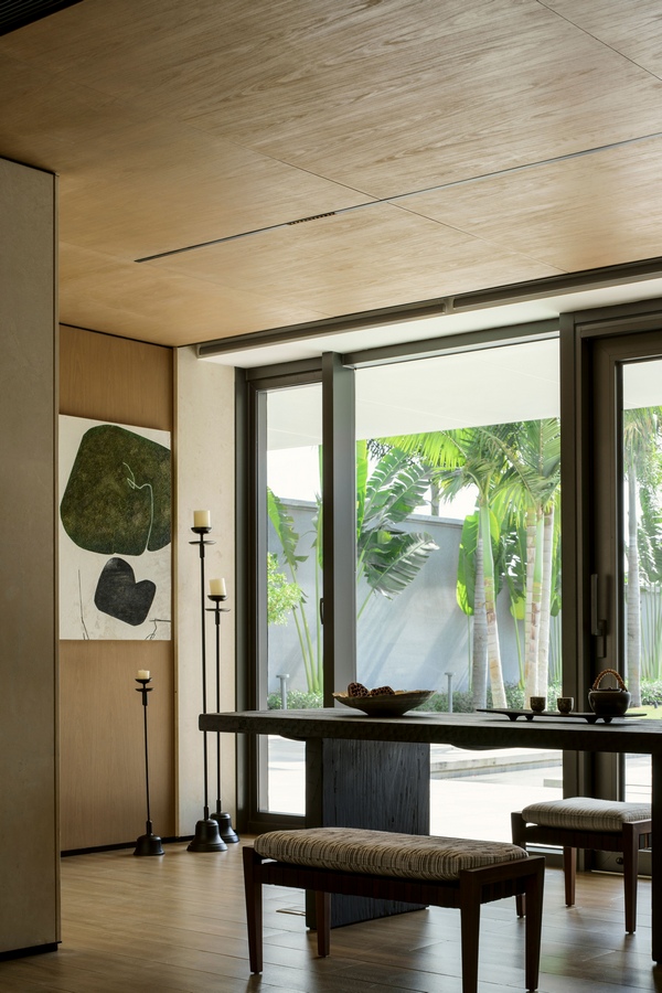 ZSD: Runner-up of World Design Awards 2025. As a convergence point of the five senses, the interior space of Bluebay Cloud Villa focuses on using local materials as emotional guides. It takes the local bamboo weaving in Hainan, natural sandstone, and the color and texture of raw wood as the design inspiration, transforming Roman traverstone, the Seine River, and bamboo weaving into material symbols in the space.