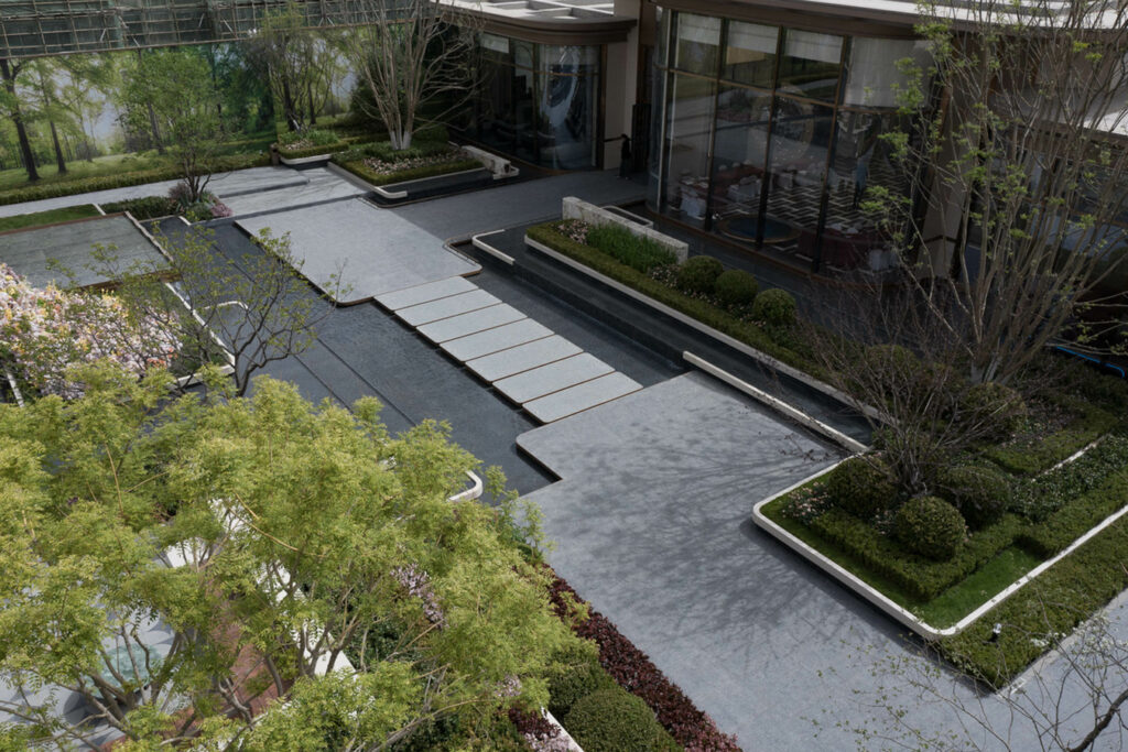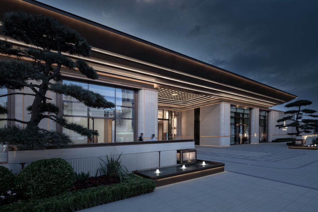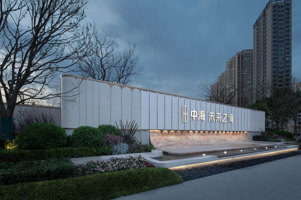 The urban living room architecture exudes understated luxury while maintaining elegance, emphasizing clean lines and exquisite details. The facade utilizes high-quality stone and metal, paired with simple lines and geometric shapes to showcase a sophisticated and dignified style, balancing aesthetics and durability. Metallic stone water features are inlaid on both sides, symbolizing the convergence of wealth in “Lishui in this life,” forming an auspicious metaphor of “wealth naturally flowing into the residence.”