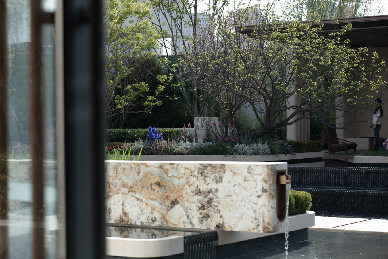 The urban living room architecture exudes understated luxury while maintaining elegance, emphasizing clean lines and exquisite details. The facade utilizes high-quality stone and metal, paired with simple lines and geometric shapes to showcase a sophisticated and dignified style, balancing aesthetics and durability. Metallic stone water features are inlaid on both sides, symbolizing the convergence of wealth in “Lishui in this life,” forming an auspicious metaphor of “wealth naturally flowing into the residence.”