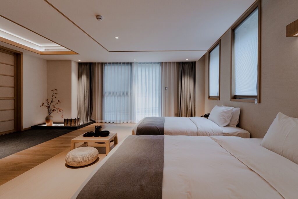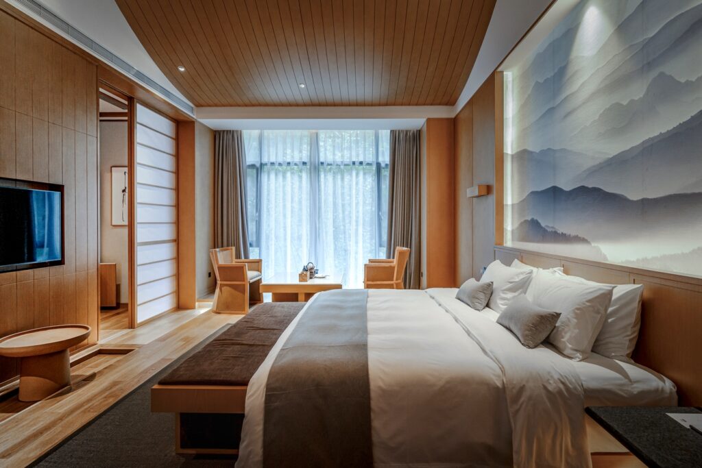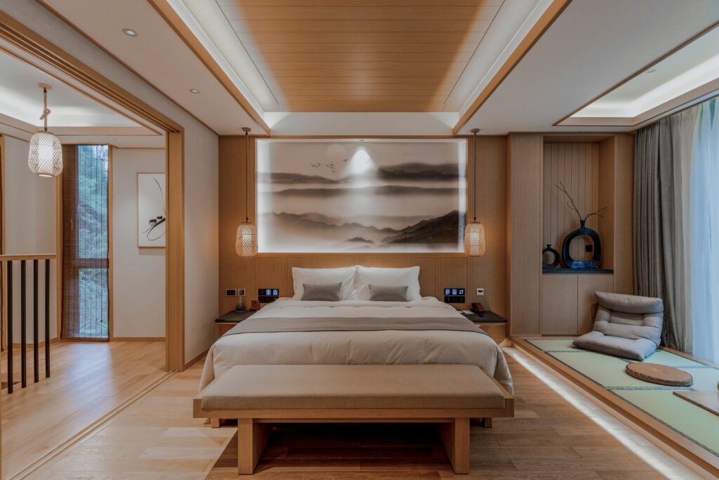 A winding path leads to a secluded place, with deep flowers and trees in the meditation room. The mountain lights delight the birds, while the pool shadows empty the hearts of the people. Zen knows no borders, it talks about the harmony between the heart and the spirit, and the teachings of Buddhism. Puxiang Hotel adheres to the teachings of Buddhism and Taoism, treating guests with “Zen”, aiming to regulate the body and mind of tired guests, cleanse their inner turmoil, and make their thoughts calm.