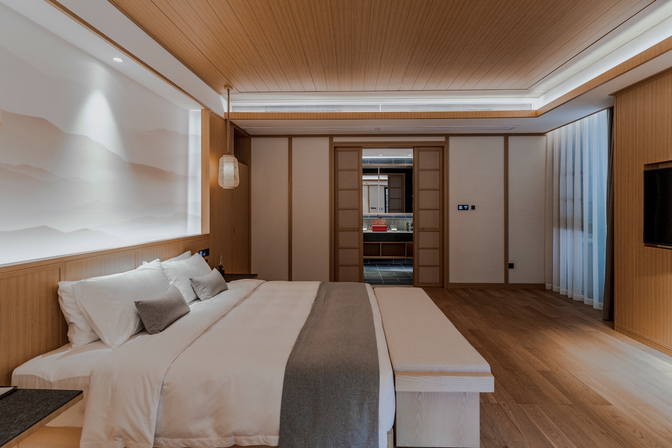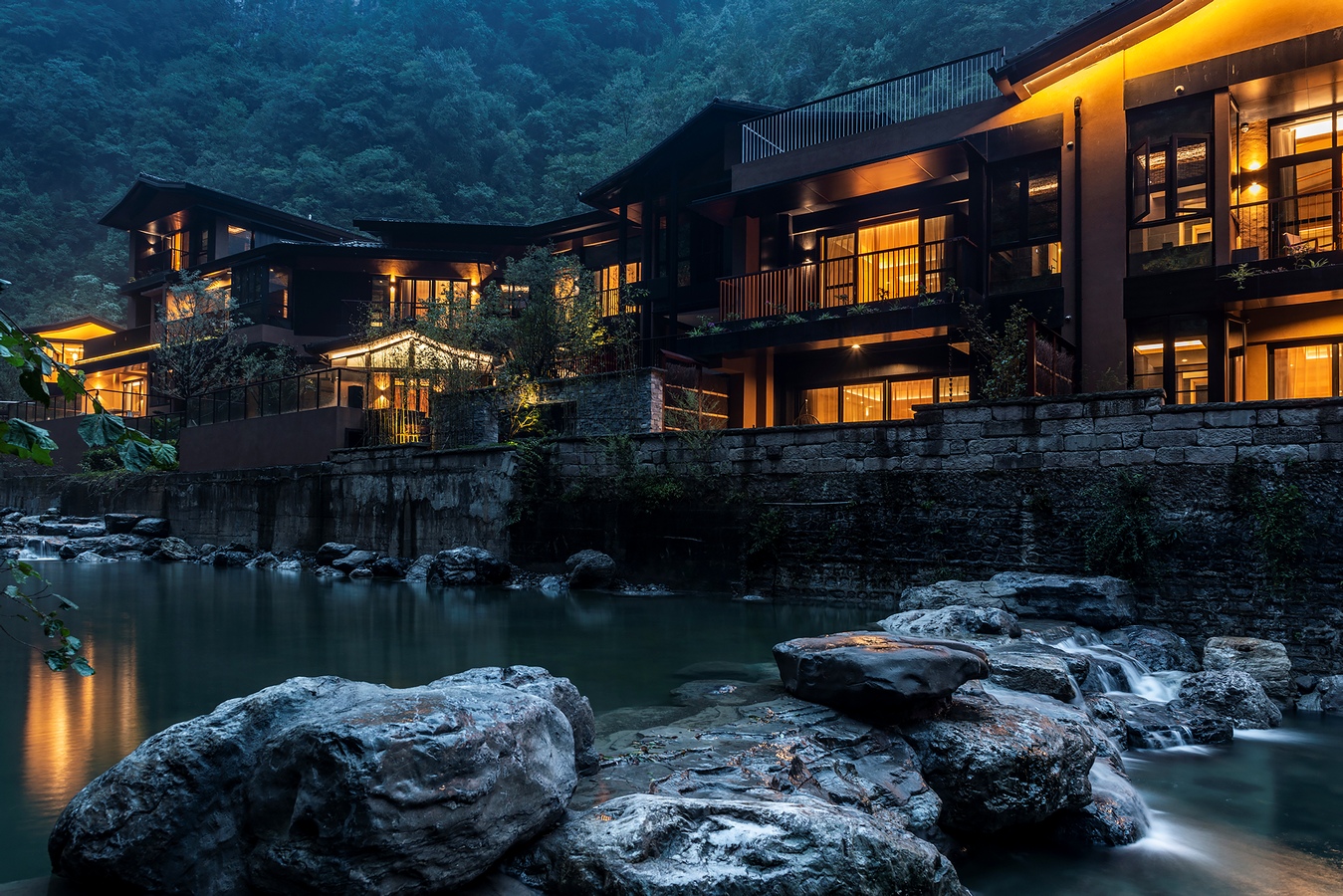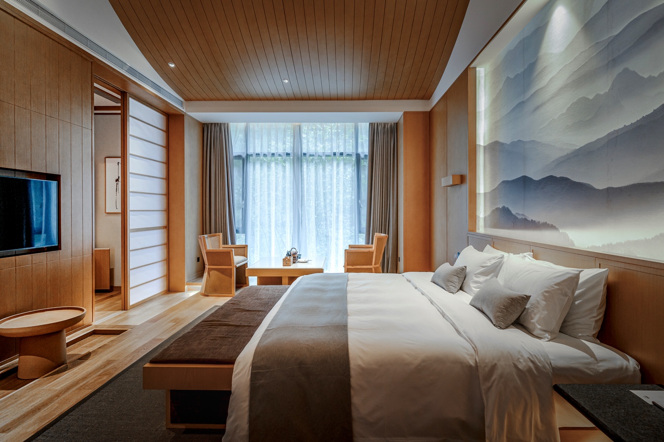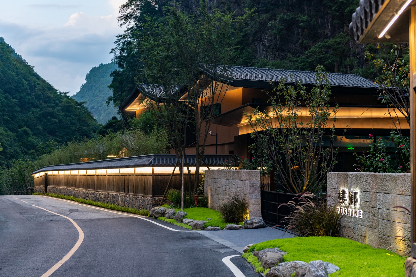 We shape light and shadow, space, and matter. The hotel building takes the form of a long strip based on the surrounding environment, and is built in the form of high and low scattered fields, village houses, small bridges, and flowing water along the mountains and streams, creating a pure, peaceful, and profound spatial feeling. The green tiles and white walls, the quaint and elegant entrance first catches the eye. There are lush pine and cypress trees planted at the entrance, and the sunlight shines on the wall through the fine cracks of the leaves, swaying gracefully. The handmade matte hammer wood grain copper plates decorated everywhere bring a warm texture to clean spaces. The bathroom is wrapped in black basalt and combined with minimalist techniques and natural elements, forming a seamless connection between the floor and walls with the same color and texture, achieving ultimate unity. The overall style of the guest room area uses warm wood grain finish and warm straw paint, and the cotton and linen bedding together to create a warm and comfortable home atmosphere. Most of the space here extends to the nature in the form of terraces or courtyards. We construct a super natural landscape through a large area of french window, which connects the interior and the external environment unreservedly, blurs the boundaries, and grows naturally. With simple design techniques and dynamic spatial layout, we introduce the natural landscape, narrow the distance between people and nature, and build an artistic and free space.