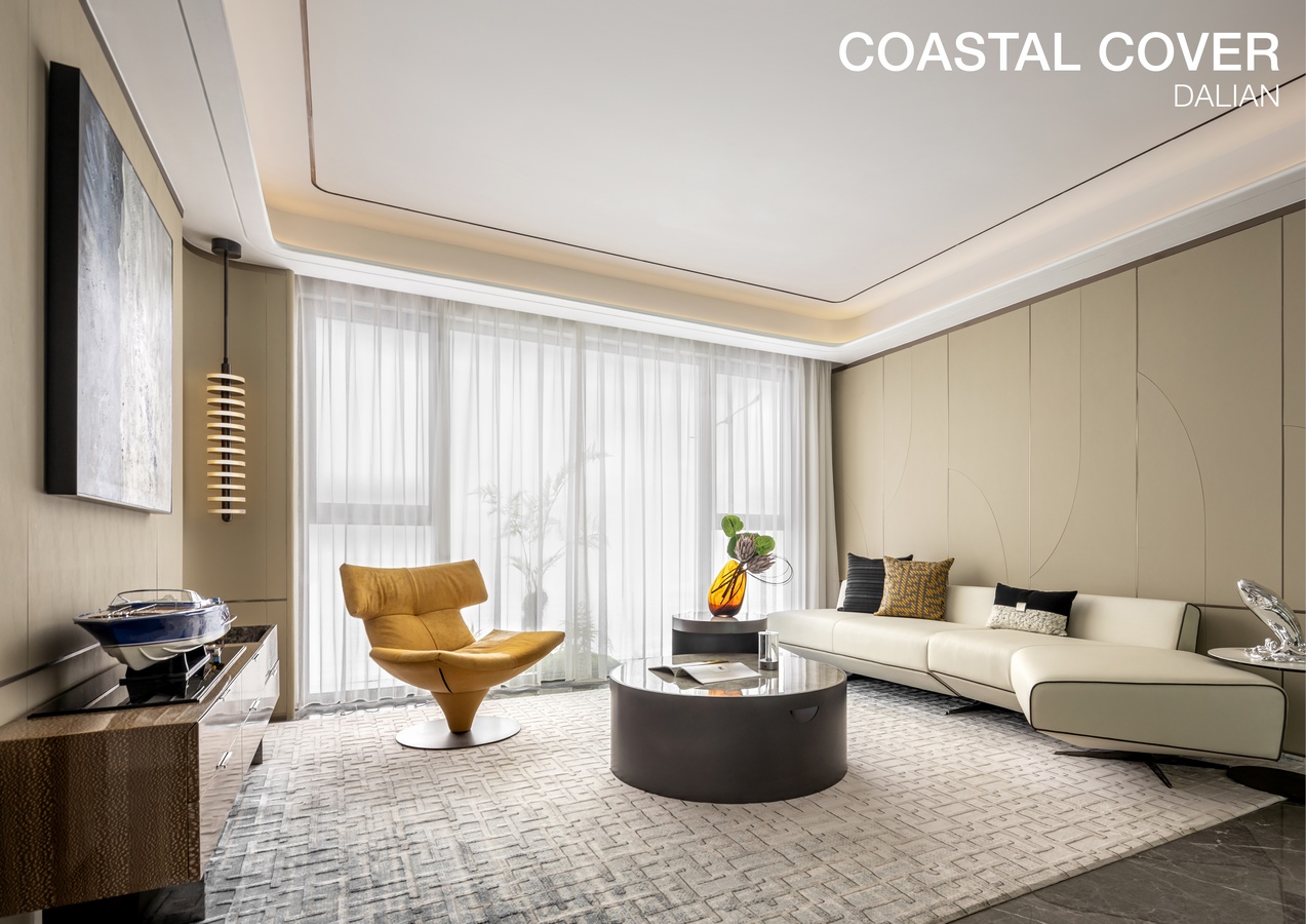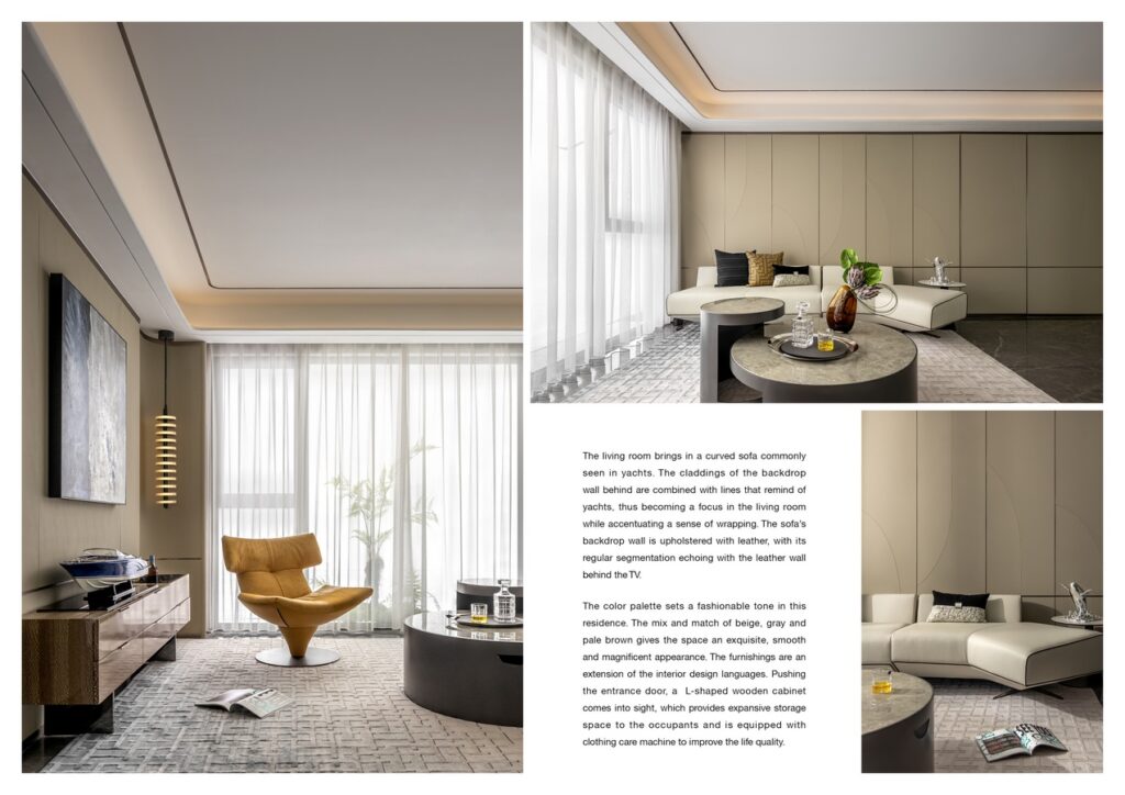 The living room brings in a curved sofa commonly seen in yachts. The claddings of the backdrop wall behind are combined with lines that remind of yachts, thus becoming a focus in the living room while accentuating a sense of wrapping. The sofa’s backdrop wall is upholstered with leather, with its regular segmentation echoing with the leather wall behind the TV.