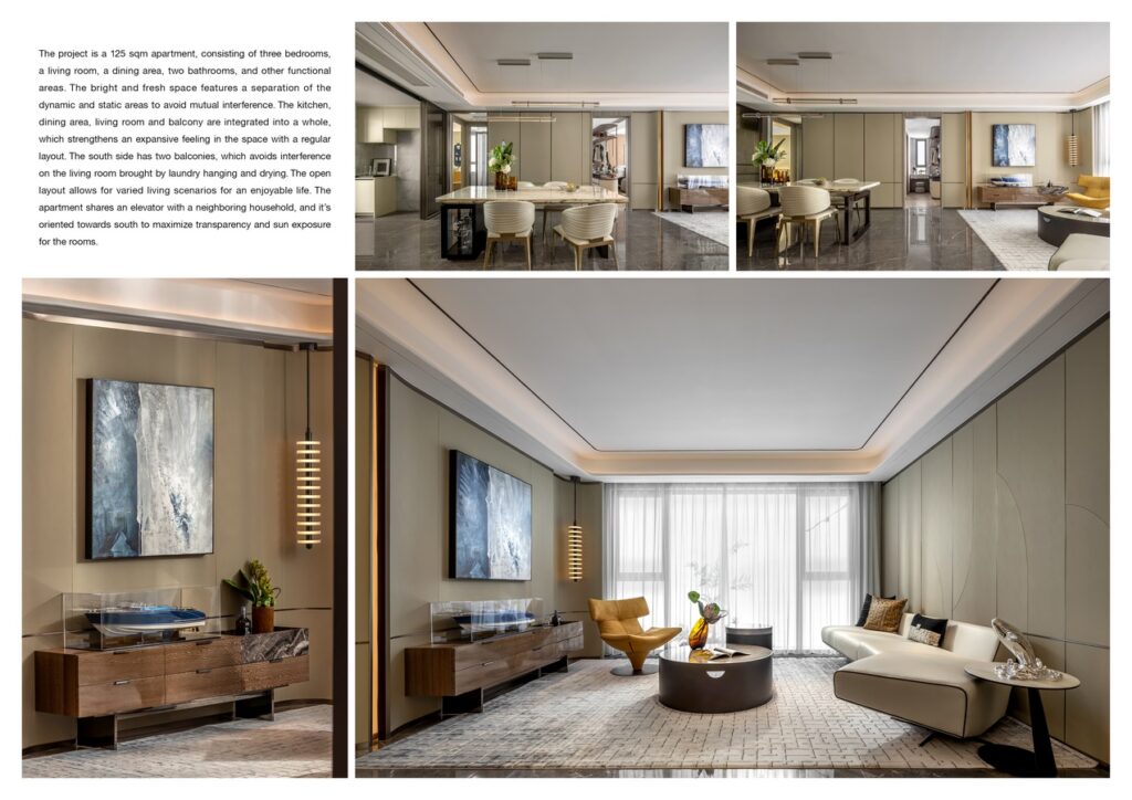 GTD: Winner of International Residential Architecture Awards 2023. The project is a 125 sqm apartment, consisting of three bedrooms, a living room, a dining area, two bathrooms, and other functional areas. The bright and fresh space features a separation of the dynamic and static areas to avoid mutual interference. The kitchen, dining area, living room and balcony are integrated into a whole, which strengthens an expansive feeling in the space with a regular layout. The south side has two balconies, which avoids interference on the living room brought by laundry hanging and drying. The open layout allows for varied living scenarios for an enjoyable life. The apartment shares an elevator with a neighboring household, and it’s oriented towards south to maximize transparency and sun exposure for the rooms.