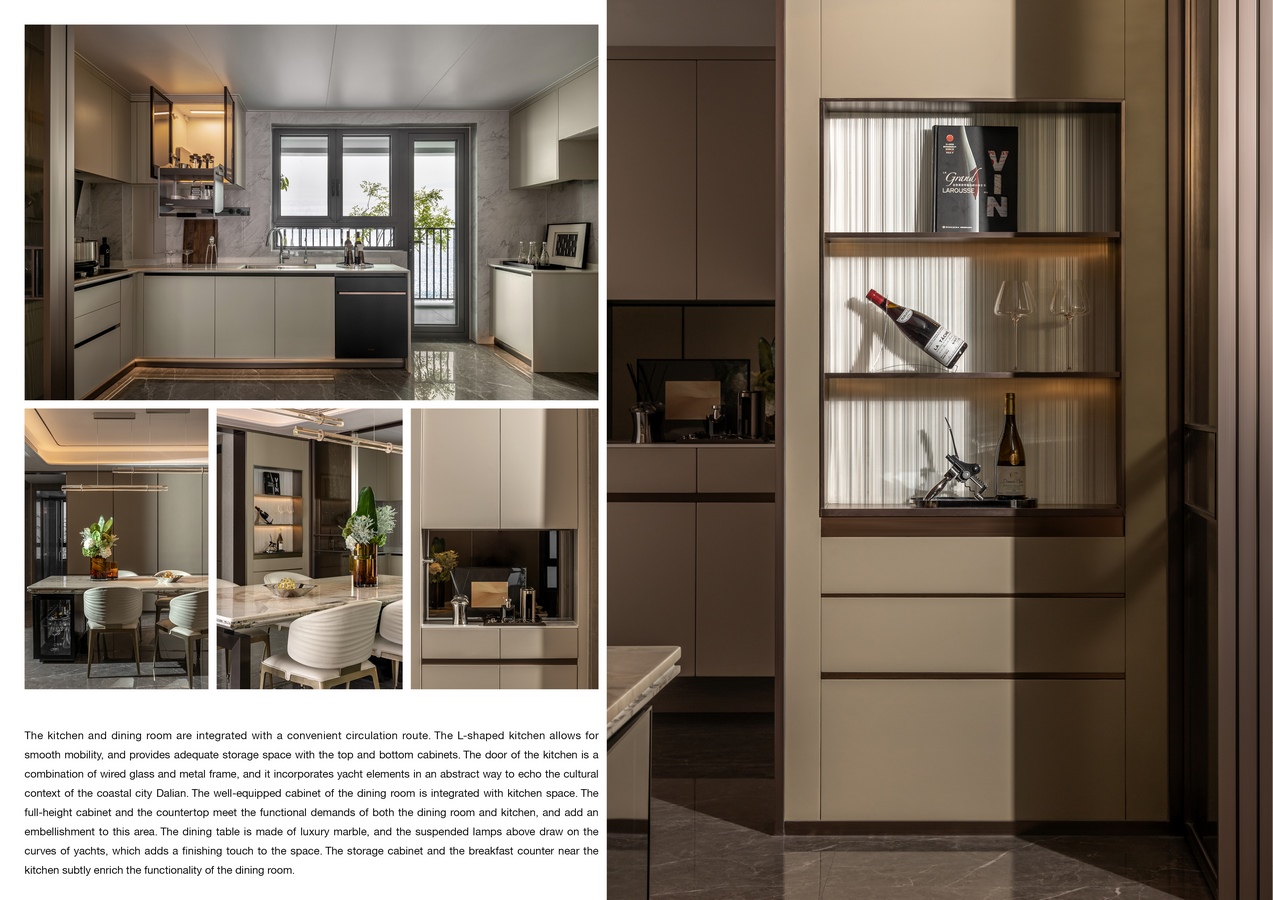 The kitchen and dining room are integrated with a convenient circulation route. The L-shaped kitchen allows for smooth mobility, and provides adequate storage space with the top and bottom cabinets. The door of the kitchen is a combination of wired glass and metal frame, and it incorporates yacht elements in an abstract way to echo the cultural context of the coastal city Dalian. The well-equipped cabinet of the dining room is integrated with kitchen space. The full-height cabinet and the countertop meet the functional demands of both the dining room and kitchen, and add an embellishment to this area. The dining table is made of luxury marble, and the suspended lamps above draw on the curves of yachts, which adds a finishing touch to the space. The storage cabinet and the breakfast counter near the kitchen subtly enrich the functionality of the dining room.