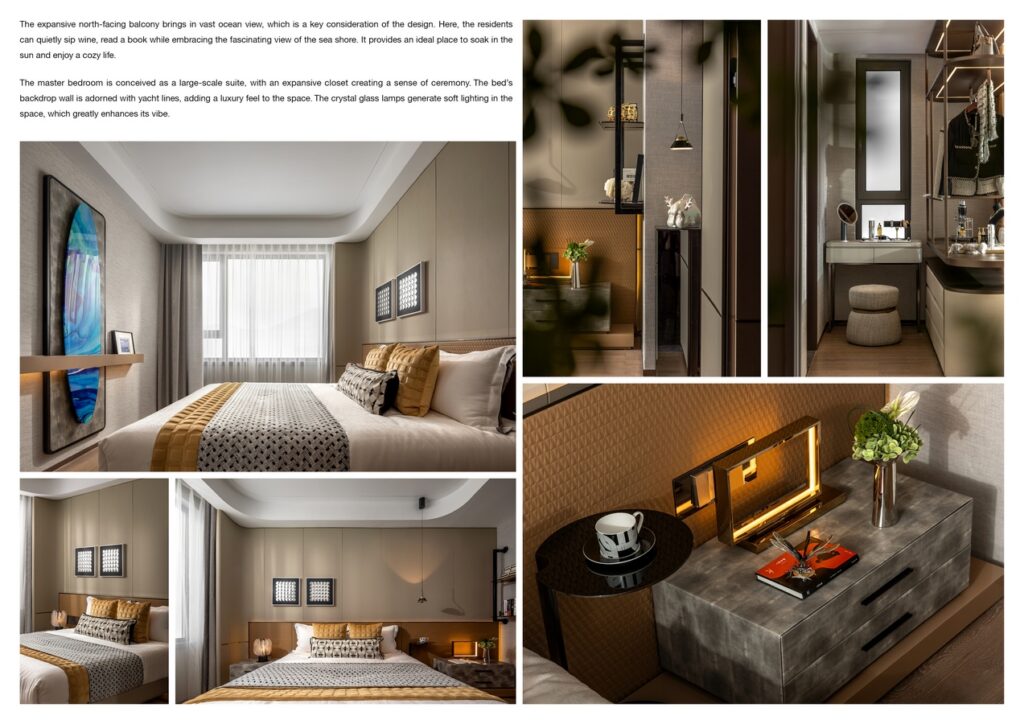 The master bedroom is conceived as a large-scale suite, with an expansive closet creating a sense of ceremony. The bed’s backdrop wall is adorned with yacht lines, adding a luxury feel to the space. The crystal glass lamps generate soft lighting in the space, which greatly enhances its vibe.