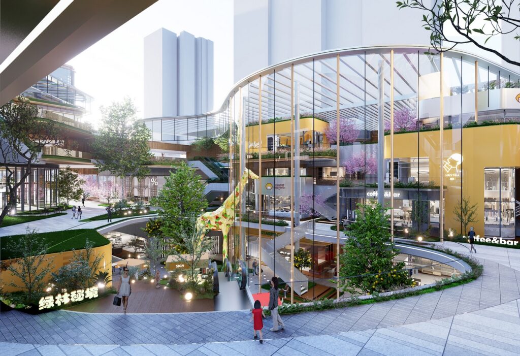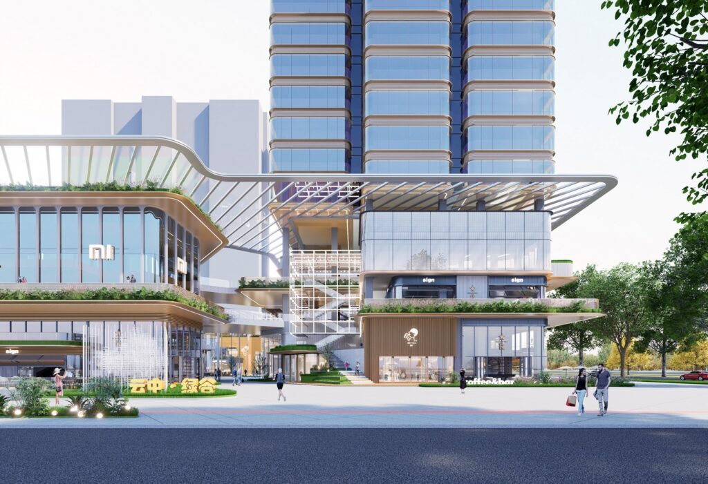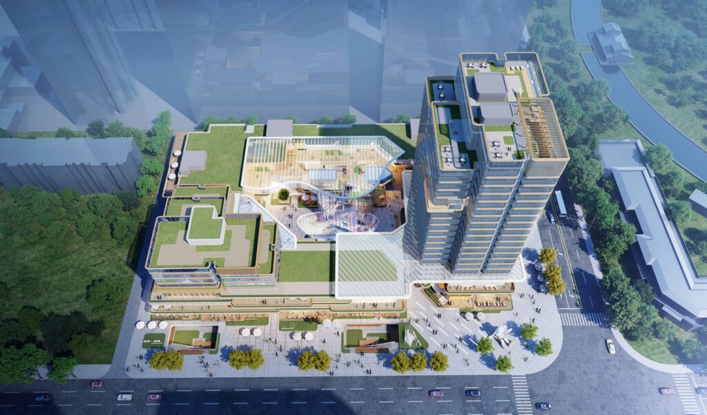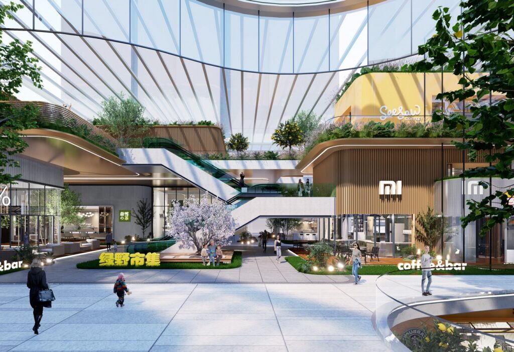Design inspiration draws from Datong’s mountain-encircled topography and the Silk Road civilization of the Northern Wei dynasty, with the spatial narrative defined as “Green Valley in the Clouds · New Rhythms of the Silk Road”, The 1,600 m² commercial plaza serves as the city’s living room, where setback strategies enhance the visibility and display of retail. The main entrance visualizes the interior green valley, translating the theme of “green infiltration.” Inside, the commercial street takes Mingtang Park as its ecological source, forming a three-dimensional ecological network through elevated platforms, terraced greenery, and aerial corridors—seamlessly linking park, architecture, and community. The inner courtyard introduces an all-season “flower house” oxygen bar, paired with transformable market installations to activate public life. Three sunken courtyards leverage site elevation to create jungle-like enclaves, where ferns and mist systems shape immersive eco-retail exploration points. The overall architectural form draws on the stratified textures of the Yungang Grottoes and the flowing imagery of camel caravans. Street-facing edges adopt folded outdoor terraces and semi-level platforms to soften the building’s mass. The façade employs parametric timber structures to form horizontal cloud-pattern rhythms, symbolizing the local aesthetic of “pavilions in the clouds”. Retail units are embedded with modular cultural IP installations (such as interactive light-and-shadow walls inspired by Northern Wei motifs), creating an experiential scene of “commercial performance”, Inter-level escalators and staggered atriums break conventional floor separation, generating a “cloud-climbing ladder” spatial journey that naturally guides foot traffic down to the B1 retail level. Green technologies—including photovoltaic curtain walls, a ground-source heat pump system, and rainwater recycling devices—constitute the project’s sustainable core, echoing the vision of a “Green Valley in the Clouds”.