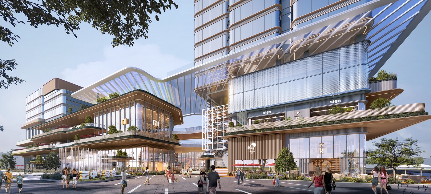 Design inspiration draws from Datong’s mountain-encircled topography and the Silk Road civilization of the Northern Wei dynasty, with the spatial narrative defined as “Green Valley in the Clouds · New Rhythms of the Silk Road”, The 1,600 m² commercial plaza serves as the city’s living room, where setback strategies enhance the visibility and display of retail. The main entrance visualizes the interior green valley, translating the theme of “green infiltration.” Inside, the commercial street takes Mingtang Park as its ecological source, forming a three-dimensional ecological network through elevated platforms, terraced greenery, and aerial corridors—seamlessly linking park, architecture, and community. The inner courtyard introduces an all-season “flower house” oxygen bar, paired with transformable market installations to activate public life. Three sunken courtyards leverage site elevation to create jungle-like enclaves, where ferns and mist systems shape immersive eco-retail exploration points. The overall architectural form draws on the stratified textures of the Yungang Grottoes and the flowing imagery of camel caravans. Street-facing edges adopt folded outdoor terraces and semi-level platforms to soften the building’s mass. The façade employs parametric timber structures to form horizontal cloud-pattern rhythms, symbolizing the local aesthetic of “pavilions in the clouds”. Retail units are embedded with modular cultural IP installations (such as interactive light-and-shadow walls inspired by Northern Wei motifs), creating an experiential scene of “commercial performance”, Inter-level escalators and staggered atriums break conventional floor separation, generating a “cloud-climbing ladder” spatial journey that naturally guides foot traffic down to the B1 retail level. Green technologies—including photovoltaic curtain walls, a ground-source heat pump system, and rainwater recycling devices—constitute the project’s sustainable core, echoing the vision of a “Green Valley in the Clouds”.