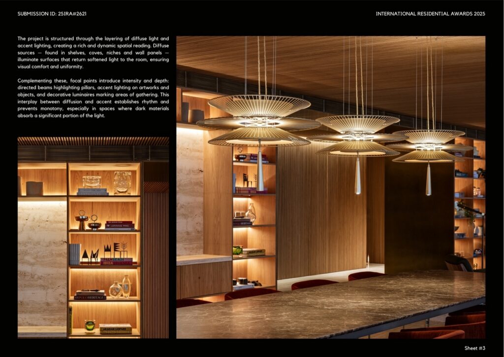 The project is structured through the layering of diffuse light and accent lighting, creating a rich and dynamic spatial reading. Diffuse sources — found in shelves, coves, niches and wall panels — illuminate surfaces that return softened light to the room, ensuring visual comfort and uniformity.