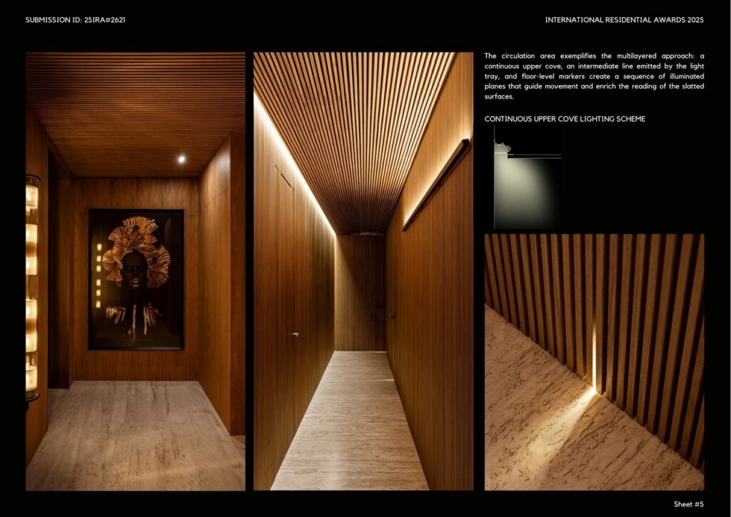 The circulation area exemplifies the multilayered approach: a continuous upper cove, an intermediate line emitted by the light tray, and floor-level markers create a sequence of illuminated planes that guide movement and enrich the reading of the slatted surfaces.
