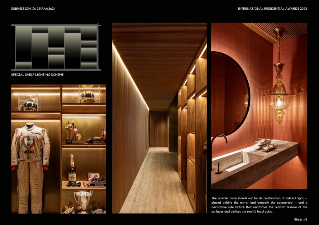 Foco Luz e Desenho: Winner of International Residential Architecture Awards 2025. At Flat Heritage, lighting was conceived as a direct extension of the architecture, shaping atmosphere, revealing surfaces and guiding spatial perception. In an environment dominated by warm wooden finishes, light becomes the element that highlights texture, deepens shadows and balances the contrasts inherent to the project.
