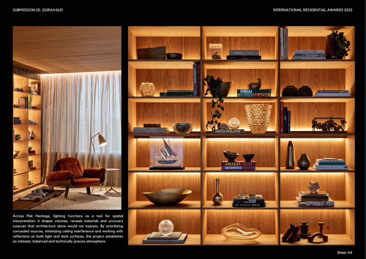 Across Flat Heritage, lighting functions as a tool for spatial interpretation: it shapes volumes, reveals materials and uncovers nuances that architecture alone would not express. By prioritizing concealed sources, minimizing ceiling interference and working with reflections on both light and dark surfaces, the project establishes an intimate, balanced and technically precise atmosphere. The result is an apartment in which the sensory experience is guided by light — not as an accessory, but as an integral part of the architectural composition.