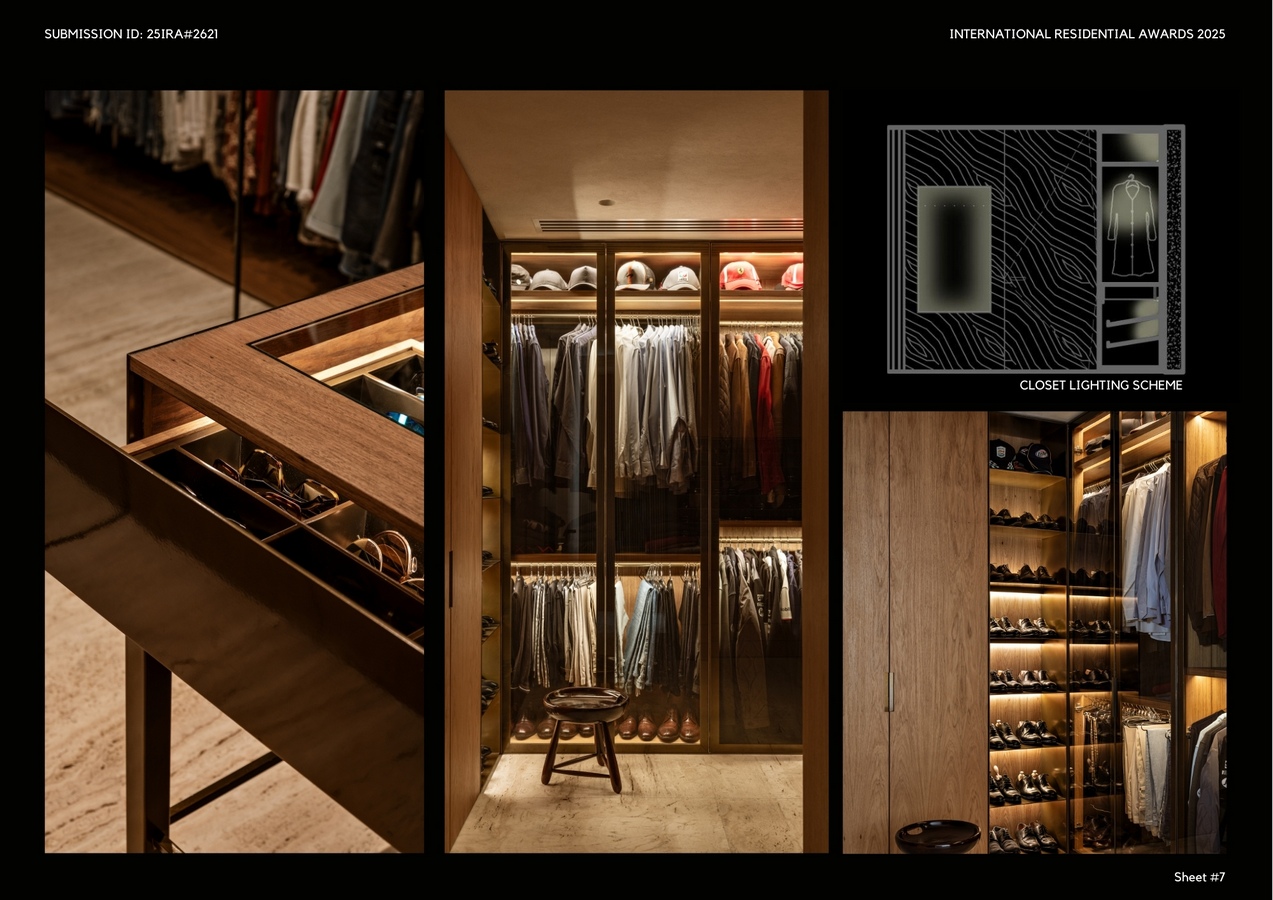 In the bedroom, light is distributed through coves, the headboard and built-in elements, producing a low-luminance, highly enveloping atmosphere. The walk-in closet uses internal lighting in niches and tensioned fabric panels that diffuse light from behind, while the central island receives dedicated illumination for personal items.