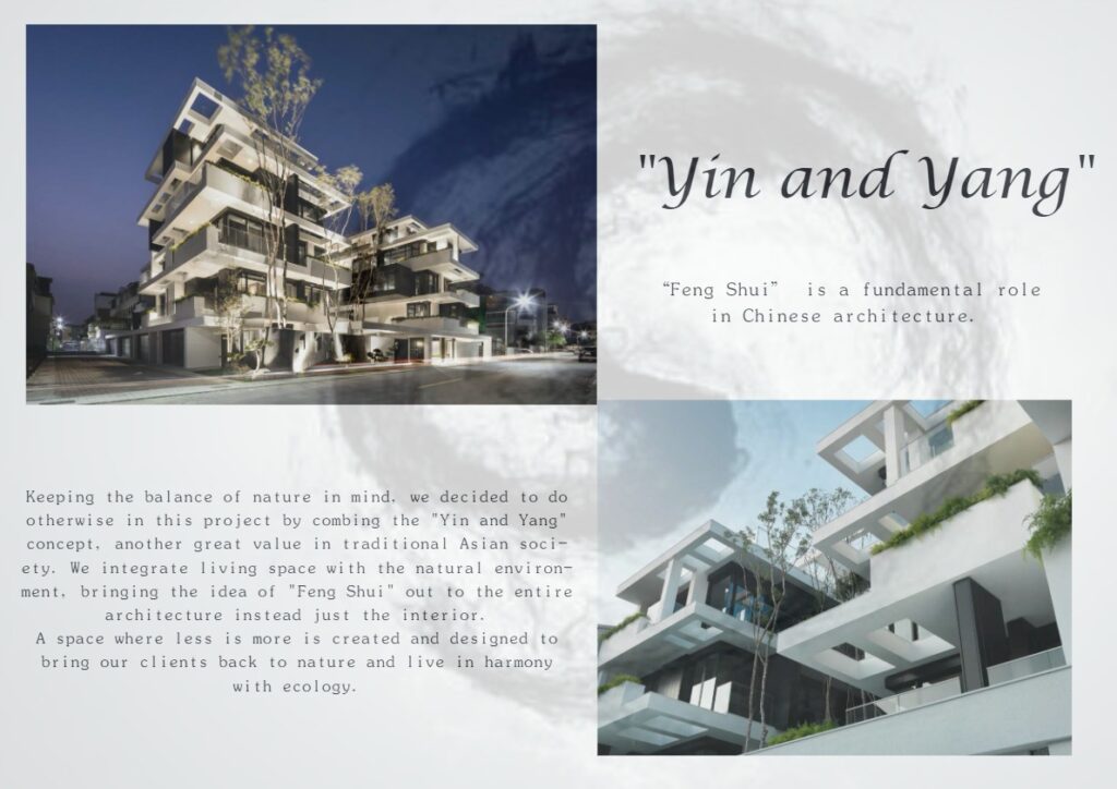 “Feng Shui” is a fundamental role in Chinese architecture. However, in the traditional Asian concept, people value the philosophy by maximizing the interior space with luxurious decorations. Keeping the balance of nature in mind, we decided to do otherwise in this project by combing the “Yin and Yang” concept, another great value in traditional Asian society. We integrate living space with the natural environment, bringing the idea of “Feng Shui” out to the entire architecture instead just the interior. A space where less is more is created and designed to bring our clients back to nature and live in harmony with ecology.
