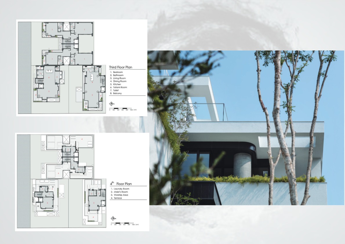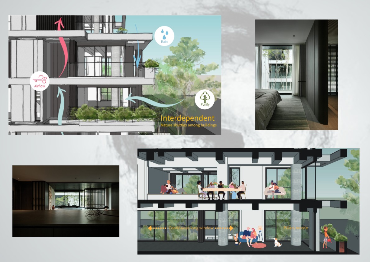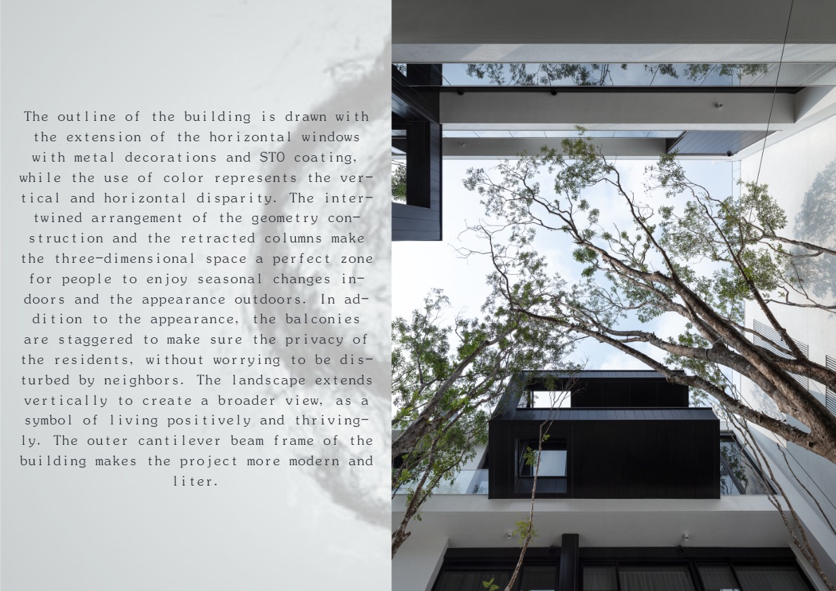 The outline of the building is drawn with the extension of the horizontal windows with metal decorations and KIKUSUI coating, while the use of color represents the vertical and horizontal disparity. The intertwined arrangement of the geometry construction and the retracted columns make the three-dimensional space a perfect zone for people to enjoy seasonal changes indoors and the appearance outdoors. In addition to the appearance, the balconies are staggered to make sure the privacy of the residents, without worrying to be disturbed by neighbors. The landscape extends vertically to create a broader view, as a symbol of living positively and thrivingly. The outer cantilever beam frame of the building makes the project more modern and liter. We hope to deliver a concept to the Asian: a house is more than just an everyday luxurious material comfort but a place to internalize our souls. It is a place for spiritual enrichment instead of material enslavement.