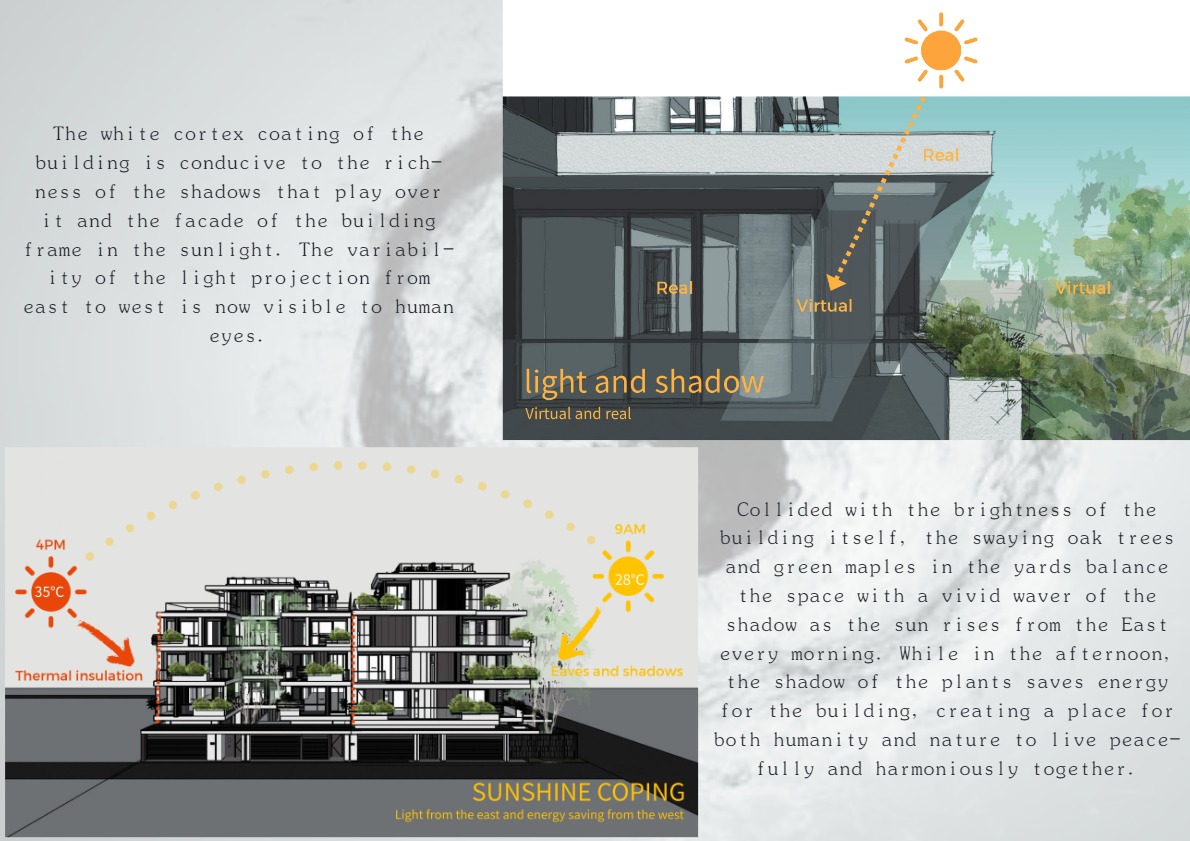 As mentioned, the white cortex coating of the building is conducive to the richness of the shadows that play over it and the facade of the building frame in the sunlight. The variability of the light projection from east to west is now visible to human eyes. We apply the Chinese philosophy of “Yin and Yang” and traditional Chinese “Feng Shui” to the architecture, making the architecture an attractive appearance and enriching meaningful connotations. Collided with the brightness of the building itself, the swaying oak trees and green maples in the yards balance the space with a vivid waver of the shadow as the sun rises from the East every morning. While in the afternoon, the shadow of the plants saves energy for the building, creating a place for both humanity and nature to live peacefully and harmoniously together.
