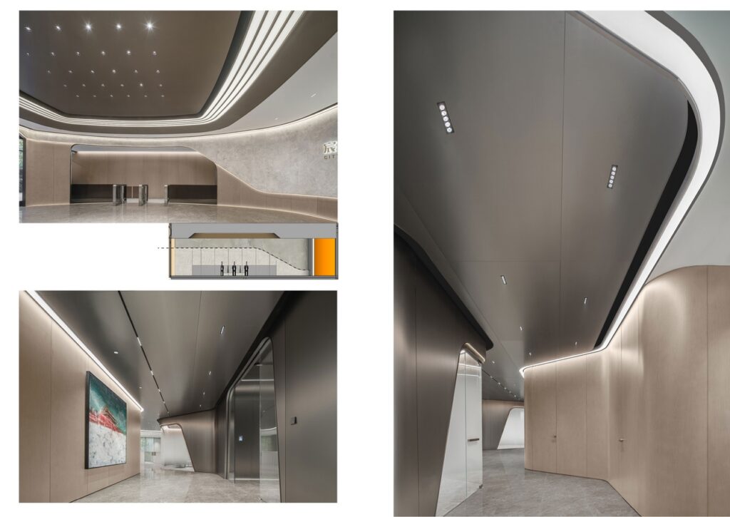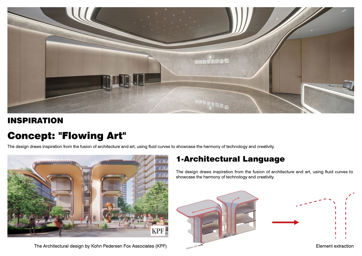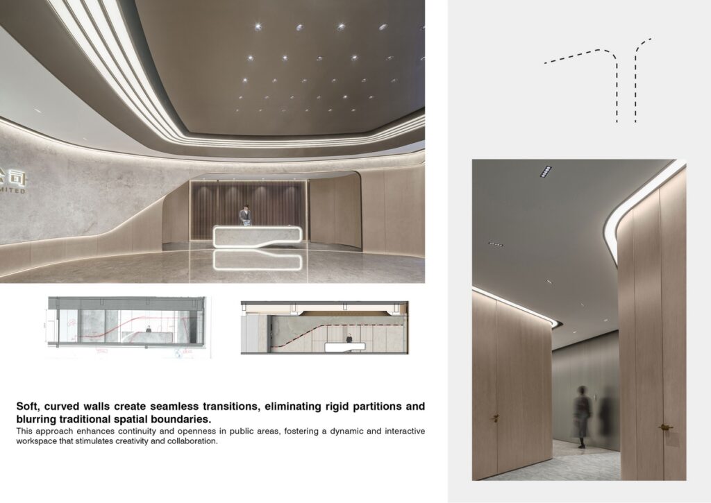 The design draws inspiration from the fusion of architecture and art, using fluid curves to showcase the harmony of technology and creativity. Soft, curved walls create seamless transitions, eliminating rigid partitions and blurring traditional spatial boundaries. This approach enhances continuity and openness in public areas, fostering a dynamic and interactive workspace that stimulates creativity and collaboration.