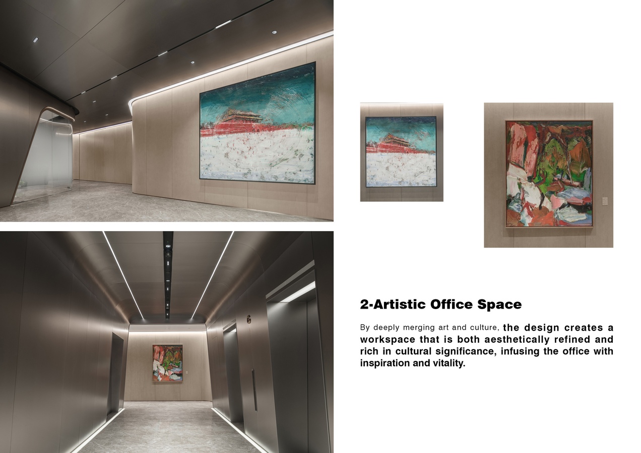 The integration of artistic elements redefines the conventional office environment, enhancing spatial experience. By deeply merging art and culture, the design creates a workspace that is both aesthetically refined and rich in cultural significance, infusing the office with inspiration and vitality.