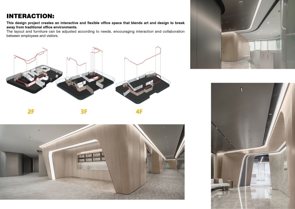 This design project creates an interactive and flexible office space that blends art and design to break away from traditional office environments. The layout and furniture can be adjusted according to needs, encouraging interaction and collaboration between employees and visitors.