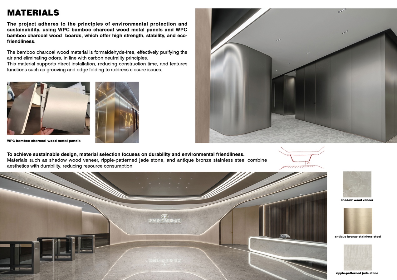 The project adheres to the principles of environmental protection and sustainability, using WPC bamboo charcoal wood metal panels and WPC bamboo charcoal wood  boards, which offer high strength, stability, and eco-friendliness. The bamboo charcoal wood material is formaldehyde-free, effectively purifying the air and eliminating odors, in line with carbon neutrality principles. This material supports direct installation, reducing construction time, and features functions such as grooving and edge folding to address closure issues.