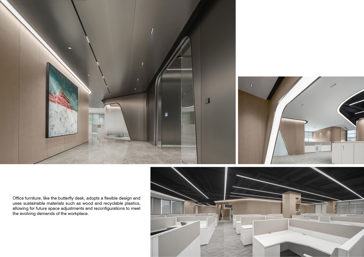 Artworks and flowing curved designs blur the boundaries of traditional offices, creating an open and innovative atmosphere. Through flexibility and sustainable design, the space adapts to changing needs over time, stimulating creativity, enhancing team collaboration, and improving work efficiency, far surpassing the limitations of traditional fixed spaces.