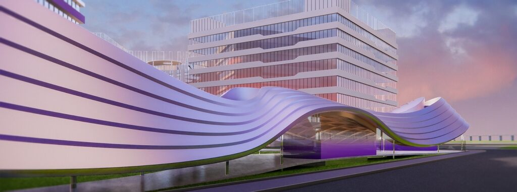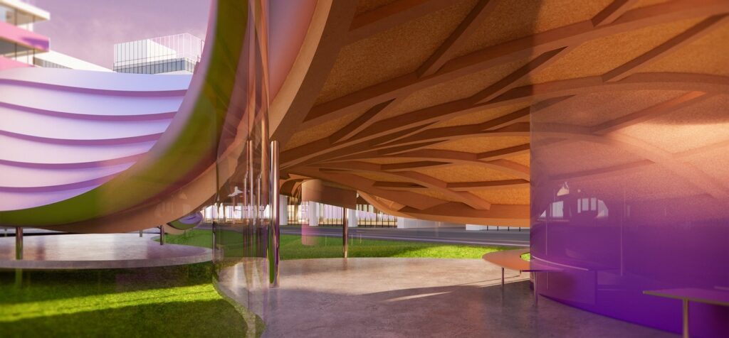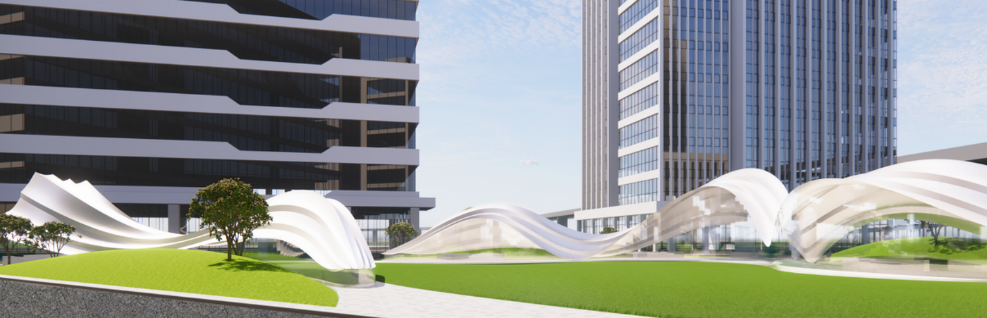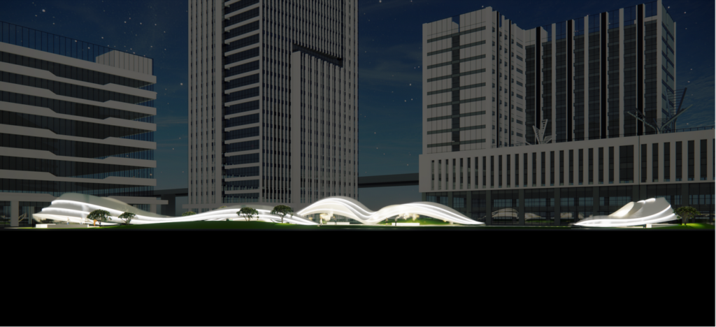 The design draws inspiration from “Maritime Silk Road Radiance,” with the pavilion resembling crystallized tidal waves amidst architecture shaped like kapok trees. Layered steel elements evoke surging currents that resonate with ancient trade routes. Radial canopies symbolize the expansive reach of the Silk Road, while topological meshes embody digital rhythms. Steel mirrors reflect the light of the Pearl River, and parametric panels cast dynamic shadows, reinterpreting Cantonese craftsmanship into a luminous spatial symphony.