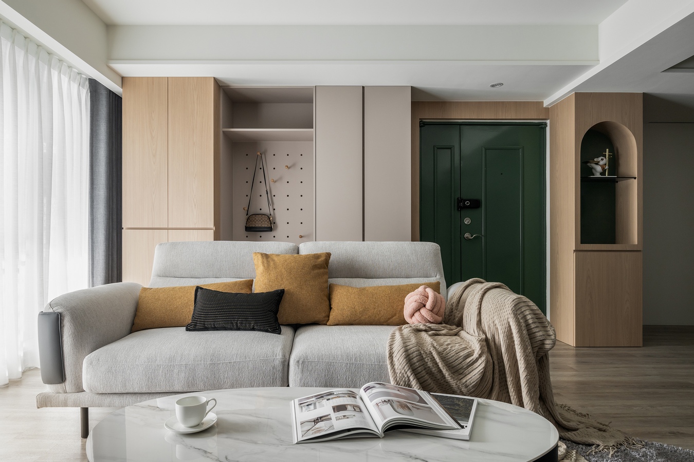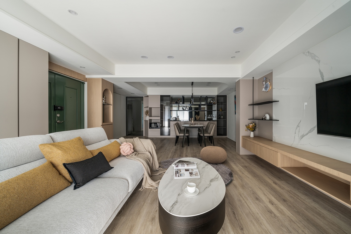| The defining highlight of this design lies in the seamless integration of “preservation and innovation”. The space adopts a warm, earthy palette complemented by soft beige tones, accented with black panels and gray mirrors to create an atmosphere that is both grounded and rich in layers. The green entrance door, initially a design constraint, was cleverly transformed into a distinctive highlight through the use of a coordinating backdrop, harmonizing with the surrounding colors. Additionally, the incorporation of curved elements serves as a key feature, softening the rigid lines of structural beams and enhancing the fluidity of the space. This elegant curvature is subtly echoed in ceiling and wall details, reinforcing a graceful design language. The spacious and open social area allows the homeowner to effortlessly transition between daily life and social gatherings, striking a flexible balance. Meanwhile, concealed storage solutions ensure both practicality and a clean, uncluttered aesthetic. Renovating an old apartment does not mean discarding the past but rather engaging in a graceful dialogue with memory. It is not about complete reinvention but about weaving the charm of the past into the aesthetics of contemporary living. |