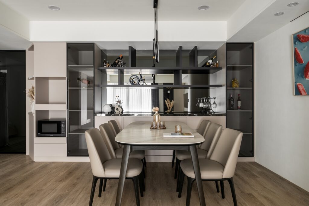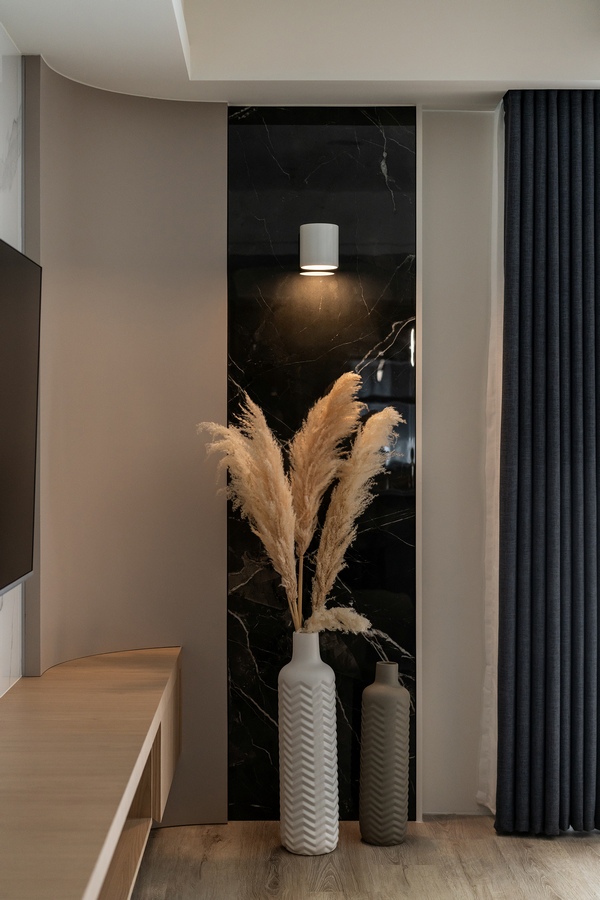 | The original wooden flooring was preserved and seamlessly integrated into the new interior design through the extension of furniture and decorative elements. The TV wall, featuring a soft white base with delicate gray stone-textured panels, enhances the modern aesthetic of the social space with a minimal yet sophisticated visual effect. To seamlessly integrate the structural beam and column, a curved extension was incorporated, softening the architectural lines while maintaining spatial fluidity. A matte black thin panel introduces a subtle yet refined texture, complementing the gary mirrored storage cabinet in the dining area. To prevent a sense of compression, the ceiling was designed with a flat surface, while selectively incorporating curved elements to introduce a softer, more inviting aesthetic. At the transition between the dining and living areas, gray mirror was chosen as the primary material for the storage cabinet. Its reflective surface further expands the perceived depth of the space, ensuring that the simplicity of the design is complemented by a rich, layered visual experience. |
