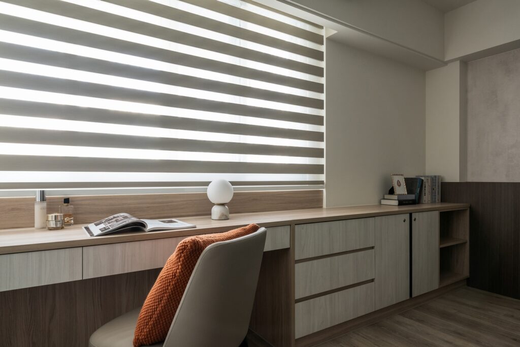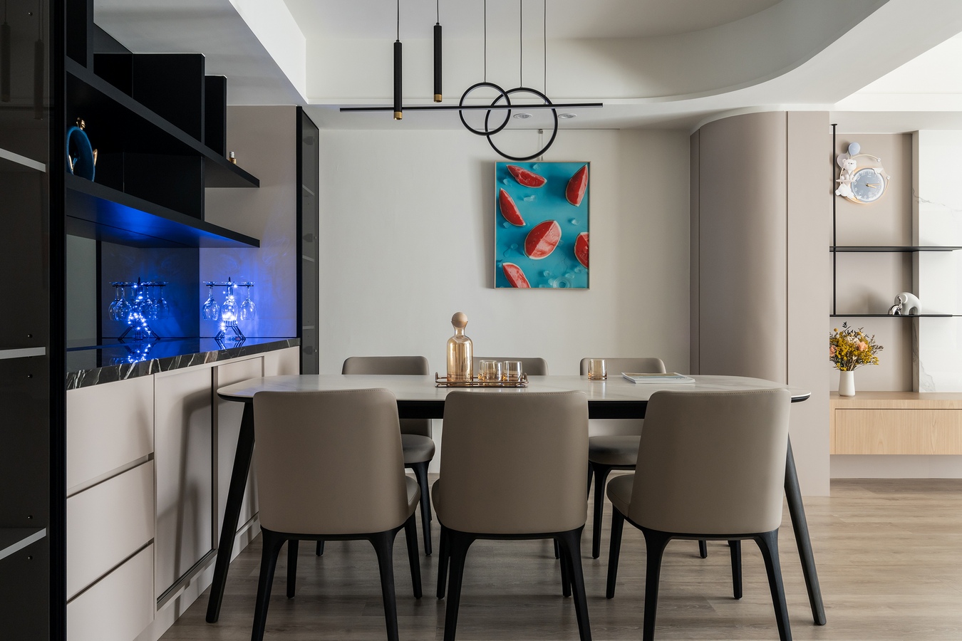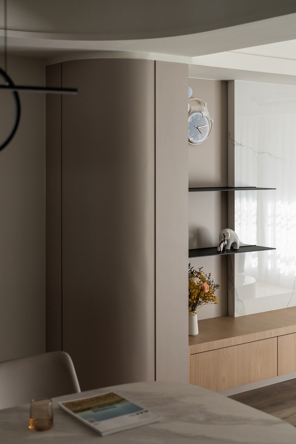 | The residence features a three-bedroom, three-bathroom layout, offering a spacious social area and a highly functional private domain. The original dual-access passage between the dining area and study was modified by sealing one side and replacing it with a glass storage cabinet. This adjustment enhances the privacy of the study while improving the overall circulation within the space. In the entryway, a slanted cabinet design provides additional storage functionality, optimizing organization. Meanwhile, concealed doors seamlessly integrate the bathroom entrances with the surrounding walls, maintaining visual consistency. Additionally, the site benefits from excellent natural lighting and ventilation. To preserve these advantages, the design team retained large windows, ensuring continuous airflow and reducing reliance on artificial lighting by maximizing the use of natural daylight. |