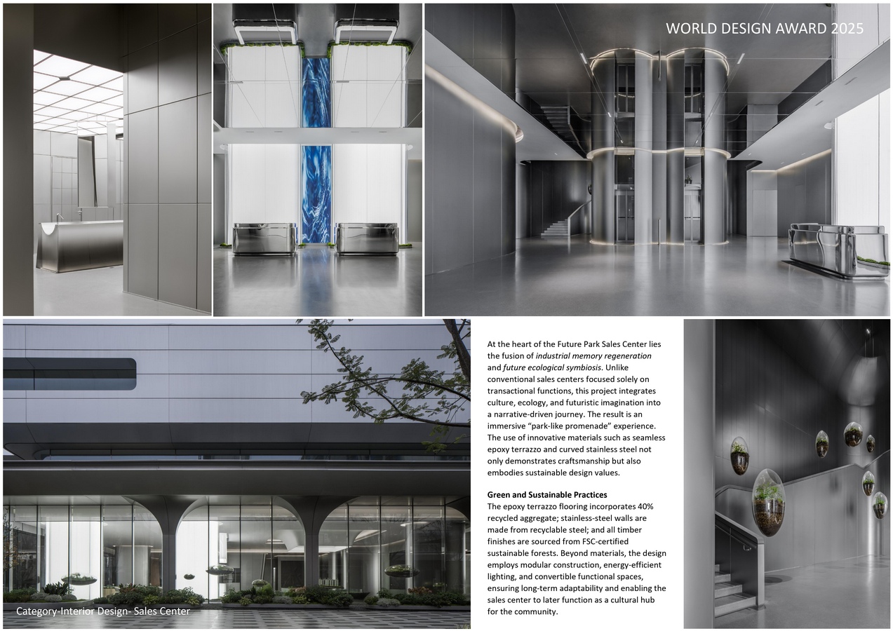 At the heart of the Future Park Sales Center lies the fusion of industrial memory regeneration and future ecological symbiosis. Unlike conventional sales centers focused solely on transactional functions, this project integrates culture, ecology, and futuristic imagination into a narrative-driven journey. The result is an immersive “park-like promenade” experience. The use of innovative materials such as seamless epoxy terrazzo and curved stainless steel not only demonstrates craftsmanship but also embodies sustainable design values.