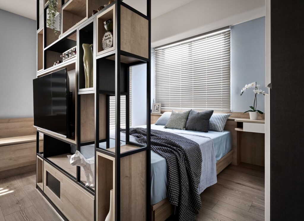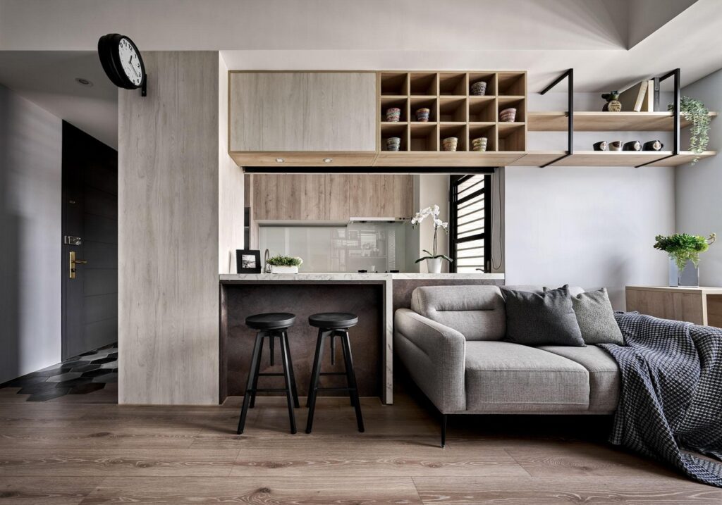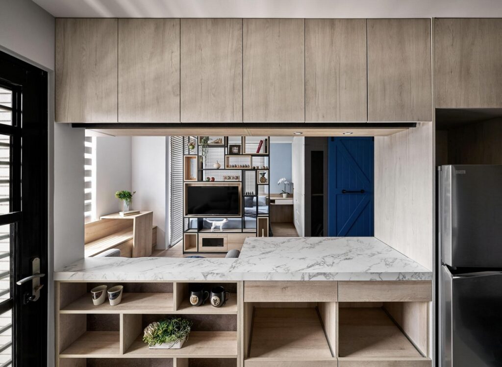 | UNIQUE PROPERTIES / PROJECT DESCRIPTION/DIFFERENTIATION | [Sliding Sunlight] Though the space is small, its story runs deep. As soon as one opens the door, a large window on the rear balcony stretches the view toward the horizon—suggesting that life’s path evolves from simplicity to richness. At the center, a rotating island acts like the heartbeat of the space, serving as a preparation station, an impromptu resting area, and even a performance platform for greeting guests. The TV wall no longer serves merely as a divider, but rather as an interface that seamlessly links the master bedroom with the public area. Complemented by dual-sided steel frames and a sliding table, the circulation flows flexibly throughout daily life. [Flexible Demarcation] The couch area presents another serene focal point. A sliding table adjacent to the window can be retracted or revealed at will, making daily rituals—such as brewing tea, reading, or quietly watching the cherry blossoms—an intimate part of everyday living. The “barn door” features a striking Prussian blue accent; it is not just a stylistic marker but also serves as a functional cue bridging the bedroom and the bathroom. The designers intentionally employed a strategy of “flexible demarcation” throughout the space—from the truss-based spatial divisions, glass sliding doors, and extendable pull-door cabinets, to the floor boundaries created by hexagonal tiles in the foyer—demonstrating the “less is more” narrative in every detail. |