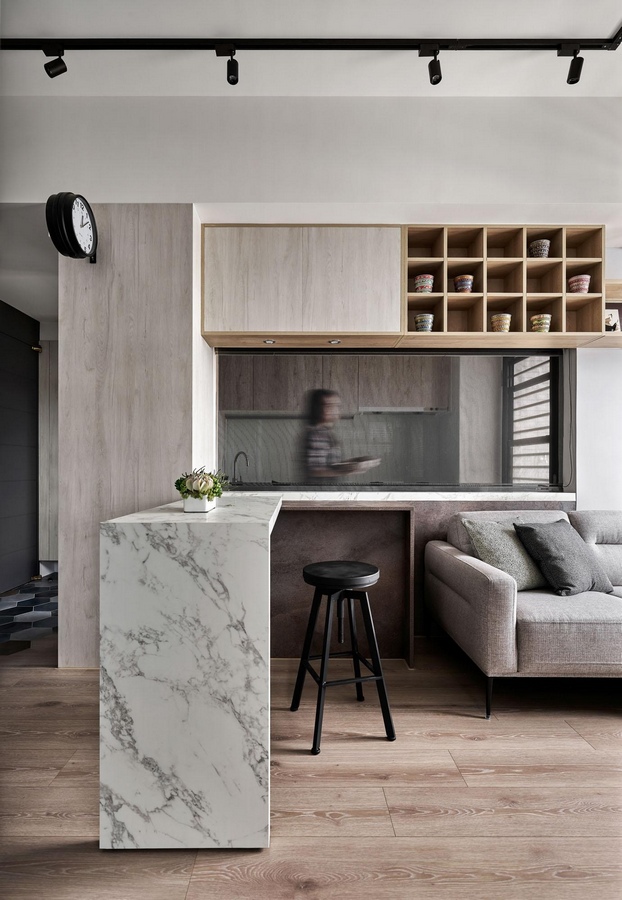 | OPERATION / FLOW / INTERACTION/FUNCTION | The couple expressed deep affection for the project, especially appreciating how the design thoughtfully addressed every detail while also planning ahead for the future. They were particularly fond of the versatile design of the central island, and the sliding table near the daybed has become a cherished spot where they can share the view, converse, and reflect. They remarked that the home is a place where one can live slowly and yet be open to unexpected joys. Additionally, to resonate with the “cradle to cradle” sustainable philosophy, the space was finished with heat-reflective undercoats and eco-friendly materials, effectively reducing the energy consumption burden caused by direct sunlight on high-rise buildings. |