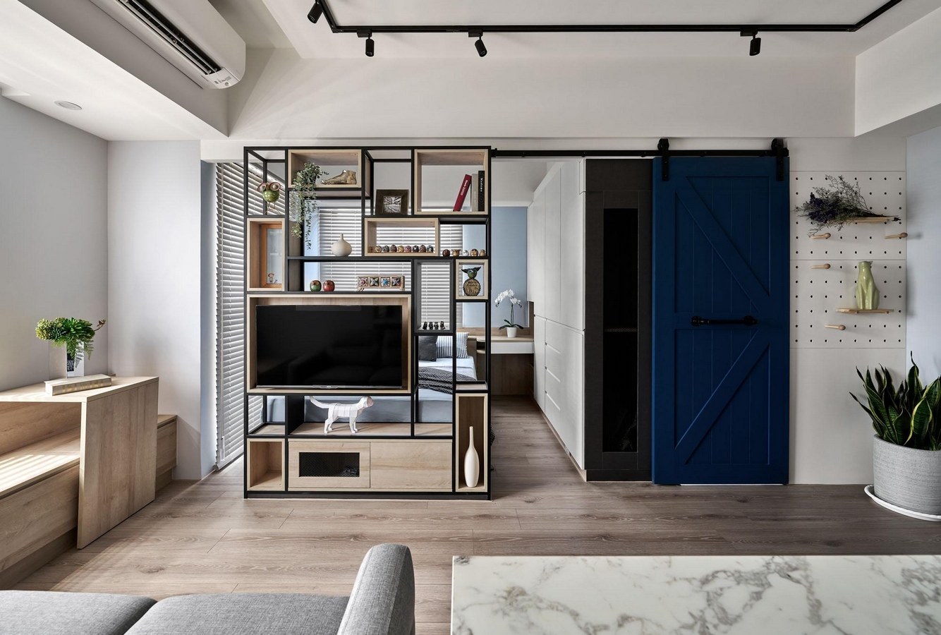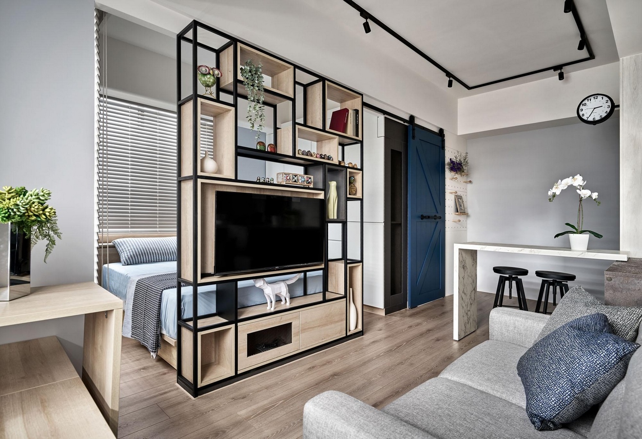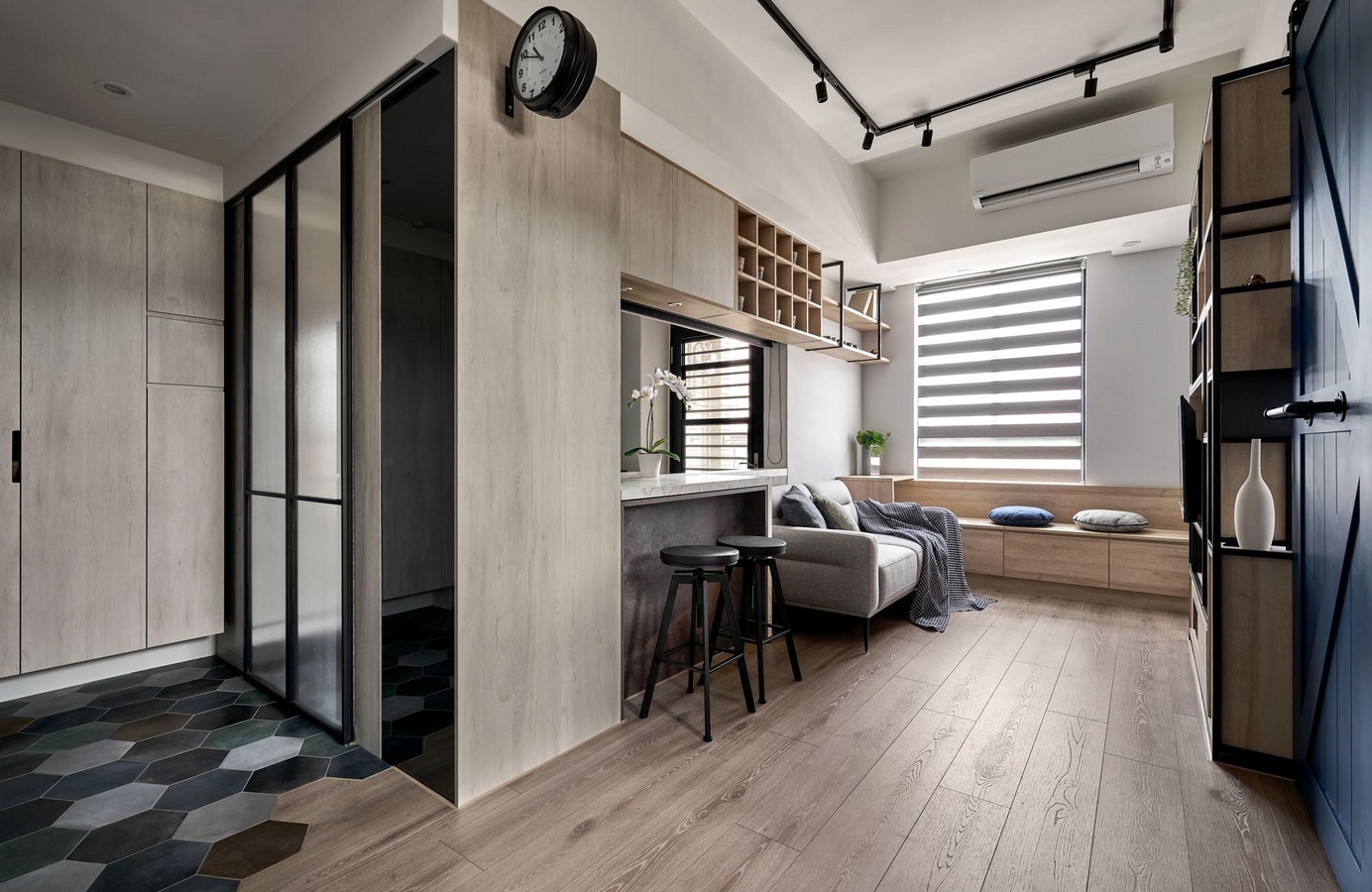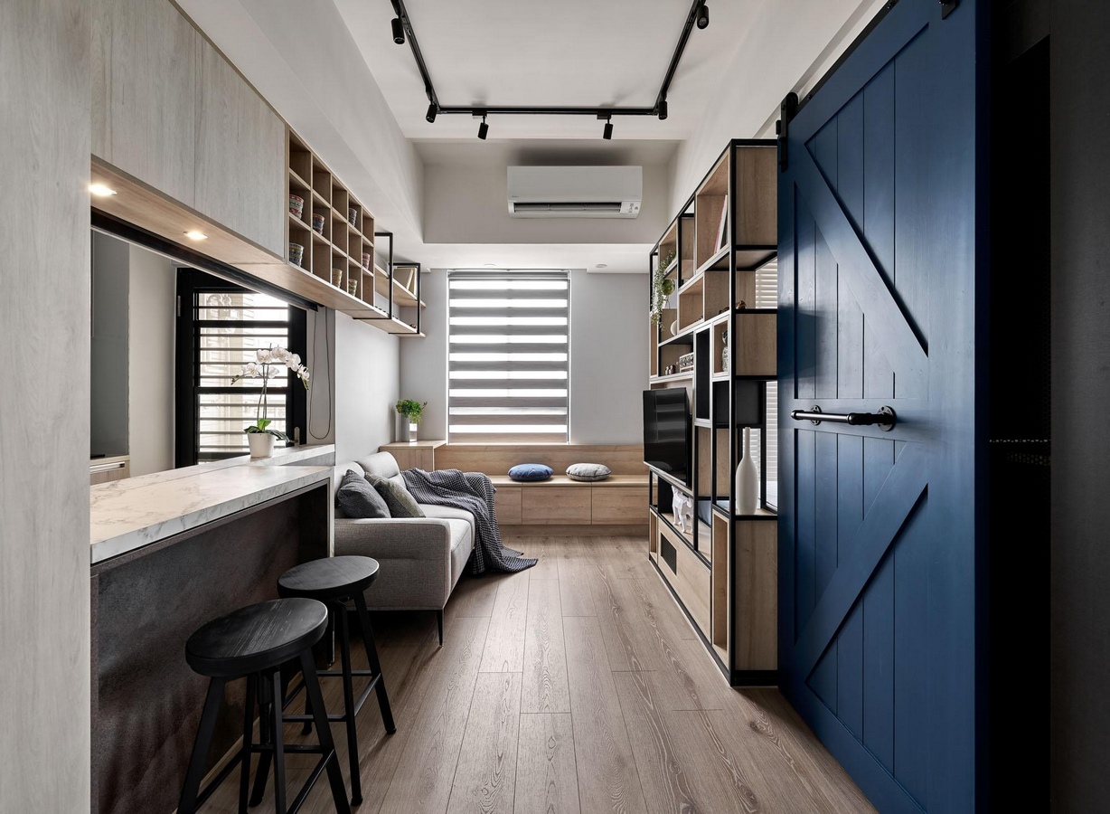 | UNIQUE PROPERTIES / PROJECT DESCRIPTION/DIFFERENTIATION | [Sliding Sunlight] Though the space is small, its story runs deep. As soon as one opens the door, a large window on the rear balcony stretches the view toward the horizon—suggesting that life’s path evolves from simplicity to richness. At the center, a rotating island acts like the heartbeat of the space, serving as a preparation station, an impromptu resting area, and even a performance platform for greeting guests. The TV wall no longer serves merely as a divider, but rather as an interface that seamlessly links the master bedroom with the public area. Complemented by dual-sided steel frames and a sliding table, the circulation flows flexibly throughout daily life. [Flexible Demarcation] The couch area presents another serene focal point. A sliding table adjacent to the window can be retracted or revealed at will, making daily rituals—such as brewing tea, reading, or quietly watching the cherry blossoms—an intimate part of everyday living. The “barn door” features a striking Prussian blue accent; it is not just a stylistic marker but also serves as a functional cue bridging the bedroom and the bathroom. The designers intentionally employed a strategy of “flexible demarcation” throughout the space—from the truss-based spatial divisions, glass sliding doors, and extendable pull-door cabinets, to the floor boundaries created by hexagonal tiles in the foyer—demonstrating the “less is more” narrative in every detail. |