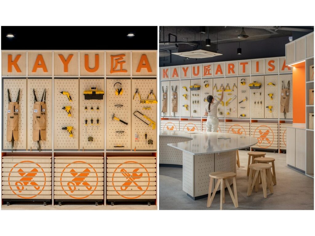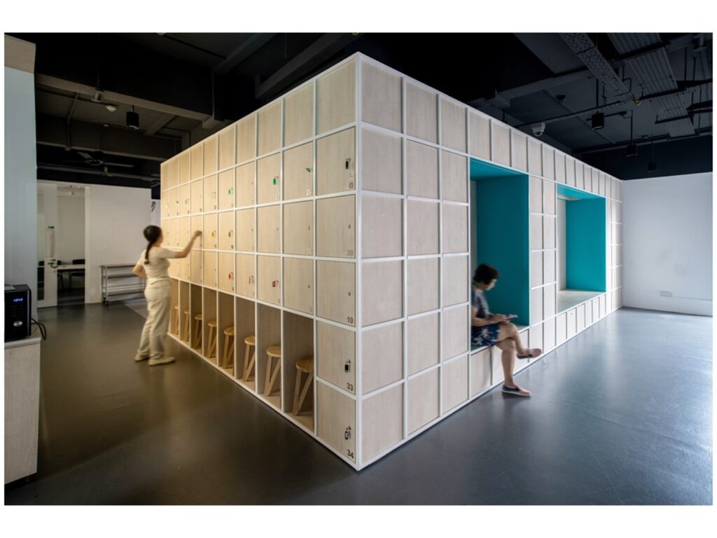 VIBRANT AND INCLUSIVE ENVIRONMENT – Materials and colours are carefully selected to complement the zoning of the three studios. Bright solid hues are paired with muted timber tones to infuse liveliness into the warm-toned spaces. As the centre has an irregular shape, an arbitrary grid system is overlaid onto the space, as a guide for users to navigate while providing a cohesive design language for the centre. This grid system is then translated into a modular frame system that is intricately detailed to accommodate the diverse needs of different settings within the centre. In the Carpentry Studio, with a workshop setting that requires ample storage, modular furniture is used to define the storage of materials and equipment. In the Active Studio, with an open concept, the modular frame system will morph into a seating and projection area for large-scale events. In the transitional area, the system becomes lockers for social workers and seniors. The modular frame system is then transformed into built-in sinks and display areas in the Culinary and Art Studio. This careful consideration of colour zoning and spatial design not only brightens up the space but also lends the centre a unique and distinctive character.