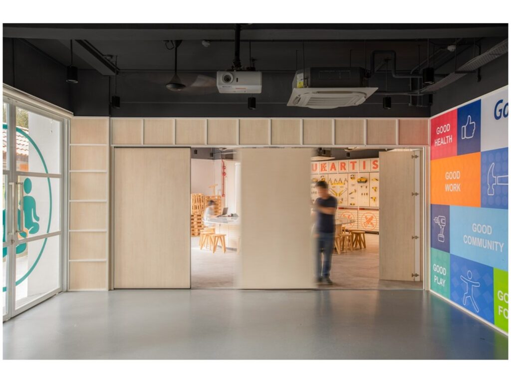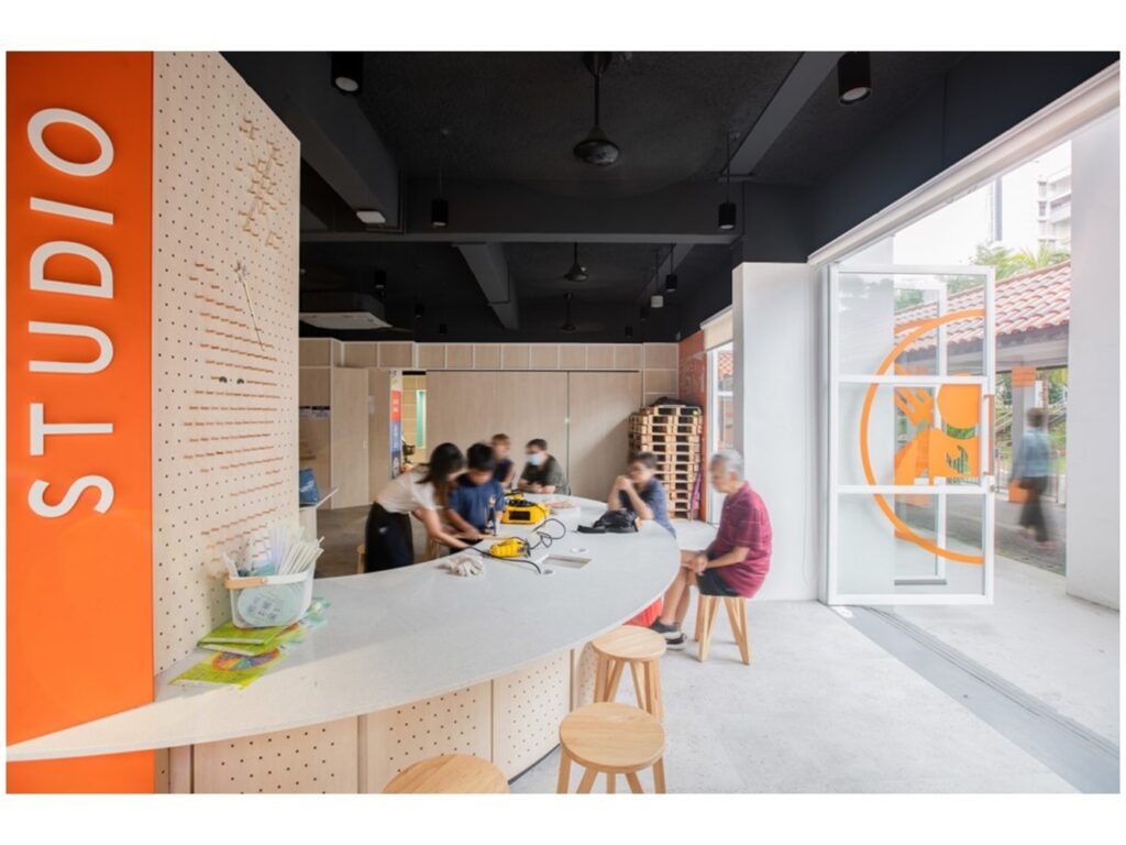 Goodlife Studio (Bukit Purmei) is a social living room for residents. Headed by Montfort Care, a social welfare organisation, “Goodlife” adopts a holistic approach to addressing the physical and mental wellness of seniors. Situated within Bukit Merah HDB flats, the vacated kindergarten is repurposed into a 300 sqm communal space encompassing 3 studios, namely Carpentry Studio, Active Studio, and Culinary Studio to create a fun and vibrant setting for lifelong learning.