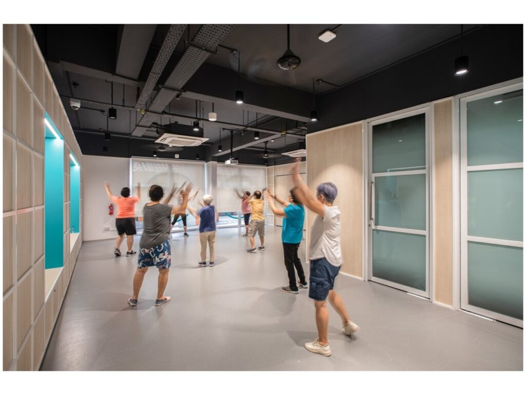 BORDERLESS AND OPEN SETTING TO ENCOURAGE PARTICIPATION – The centre is fitted with full-height glass doors, blurring the boundary between interior and exterior spaces, breaking away from the conventional gated and inward-looking senior care centre, ushering in a new model of active aging centre. Active Studio coupled with movable and collapsible furniture allows the centre to accommodate events and celebrations of different scales, creating an open and inviting setting that encourages participation from the seniors.