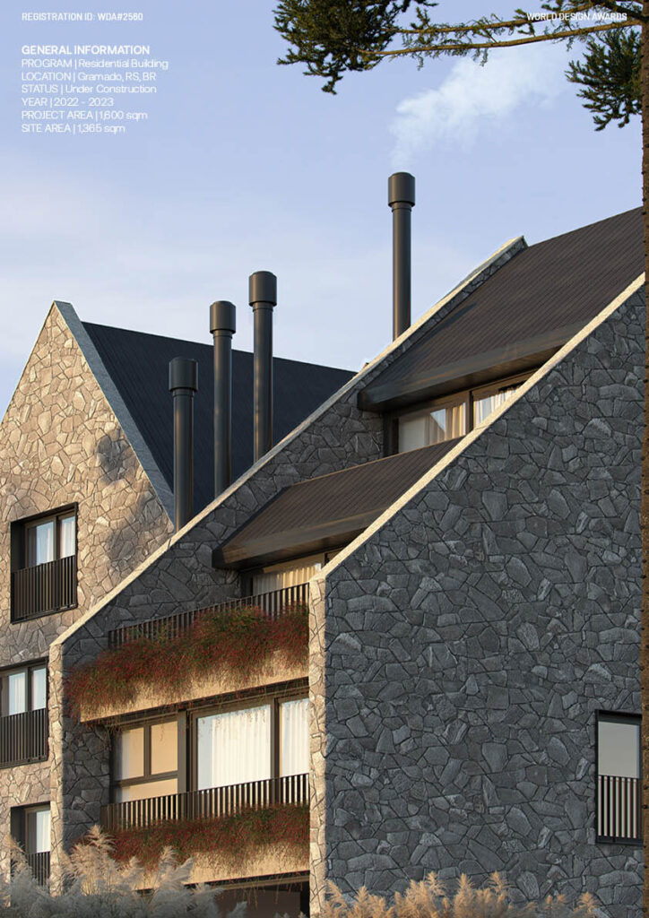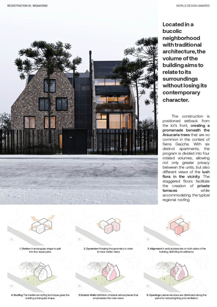 The construction is positioned set back on the lot, creating a promenade beneath the Araucaria trees that are so common in the context of Serra Gaúcha. With six distinct apartments, the program is divided into four rotated volumes, allowing not only greater privacy between the units but also different views of the lush flora in the vicinity. The staggered floors facilitate the creation of private terraces while accommodating the typical regional roofing.