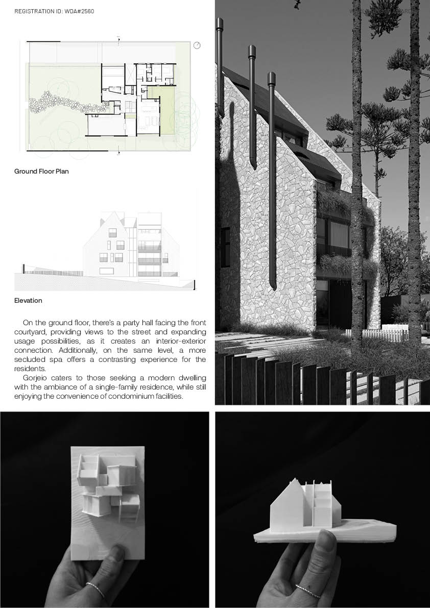 On the ground floor, there is a party hall directly linked to the open front area of the lot, providing views to the street and expanding usage possibilities. Additionally, on the same level, a more secluded spa offers a contrasting experience for the residents. “Gorjeio” caters to those seeking a modern dwelling with the ambiance of a single-family residence while still enjoying the convenience of condominium management.