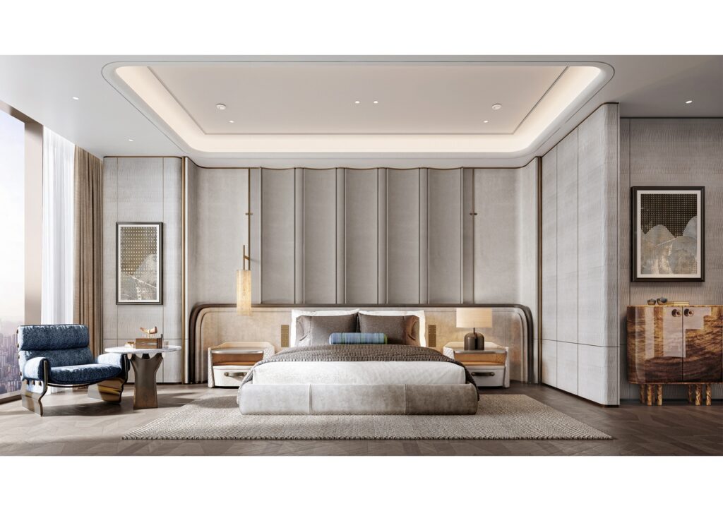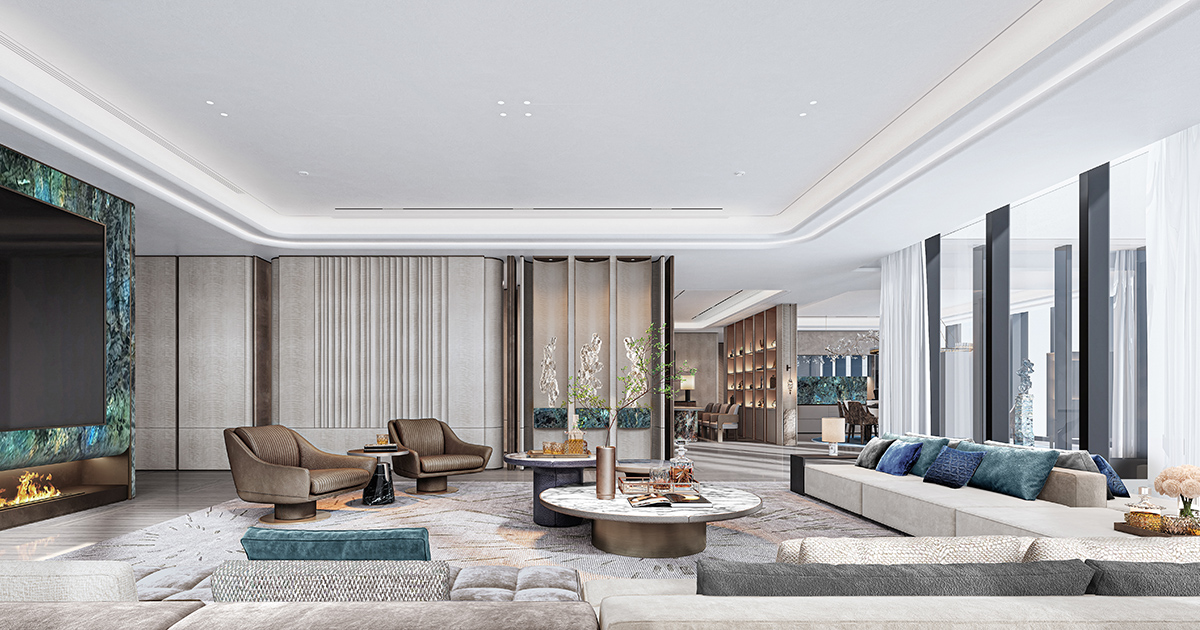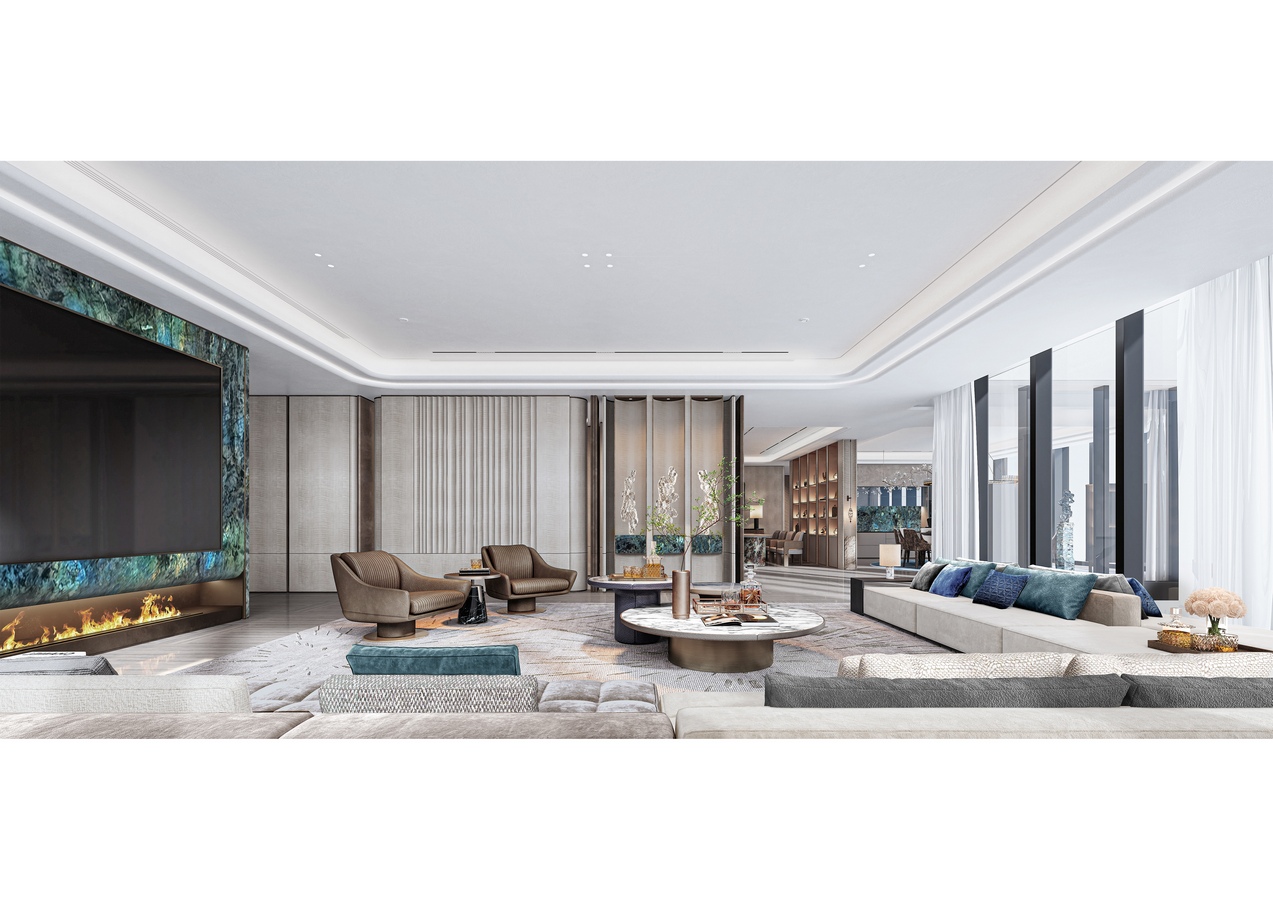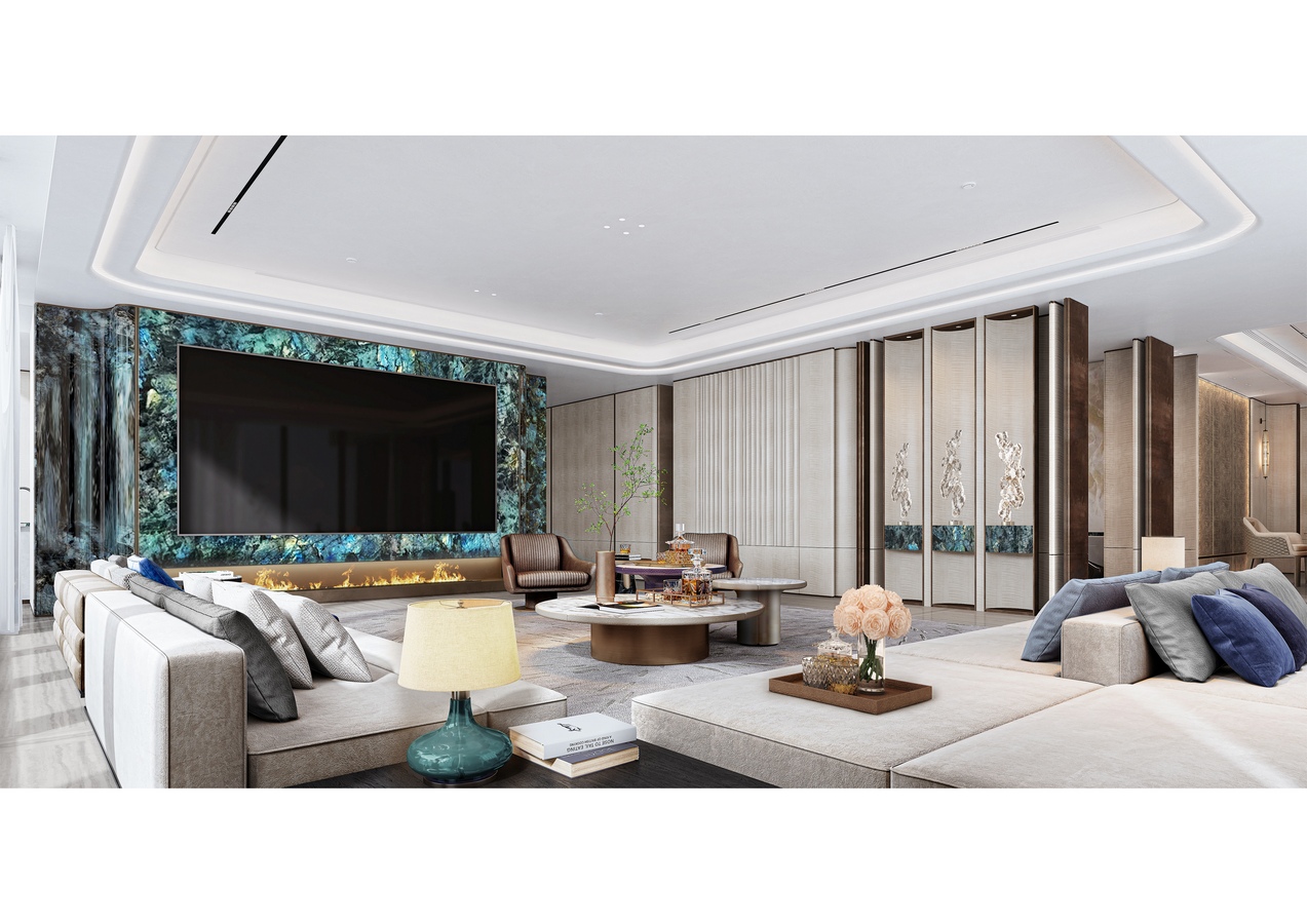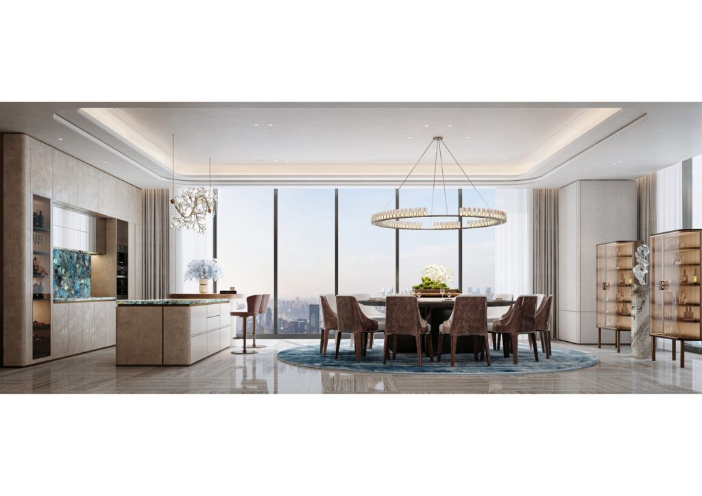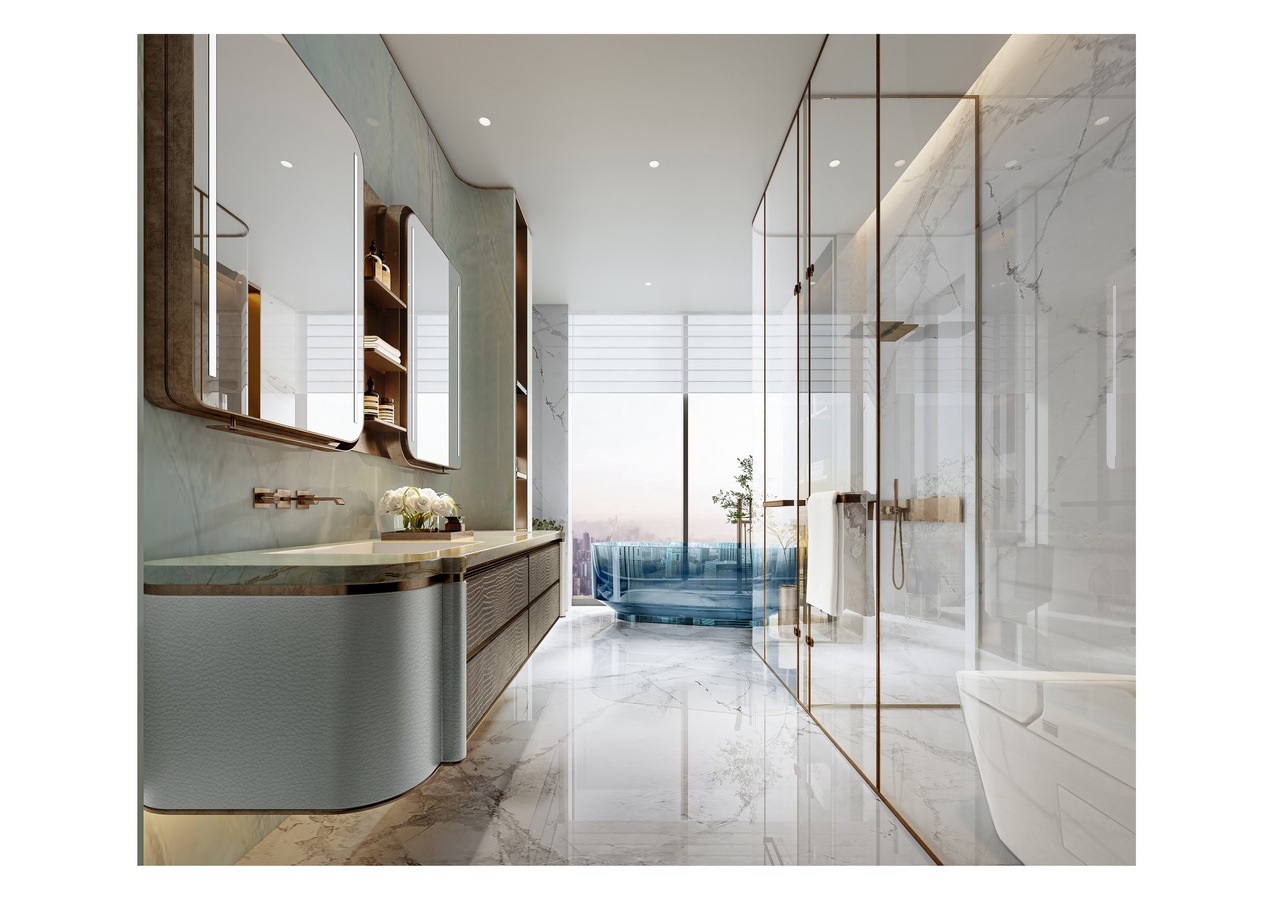 Spatially, the layout emphasizes openness and fluidity. A minimalist approach to partitions and a double-aspect curtain wall system maximize natural light and panoramic river views. Materiality reflects a refined yet understated luxury—featuring blue jade stone, wood-veined marble, shadow maple veneer, and bronze metal detailing. Integrated smart-home technology enhances both comfort and functionality.