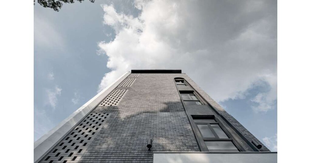 The structure is built with reinforced concrete, while the material palette is carefully curated to evoke depth and texture. Japanese reduction firing tiles and mosaic tiles create a rich, weathered patina, adding layers of character to the façade. Solid Japanese bricks are strategically placed on the exterior bathroom walls to allow natural light and ventilation to filter through while maintaining privacy. The roof is composed of steel-framed aluminum panels reinforcing the building’s structural integrity. At the entrance, the staircase sidewall is crafted from weathering steel and coated with a refined finish to form a signature logo wall which is precisely positioned to subtly obscure the views of passerbys as the owner descends the stairs, ensuring visual continuity and a harmonious spatial experience. This layered architectural envelope not only enhances the building’s depth but also establishes a tactile connection to the earth, reinforcing the impression of a structure organically emerging from the landscape.